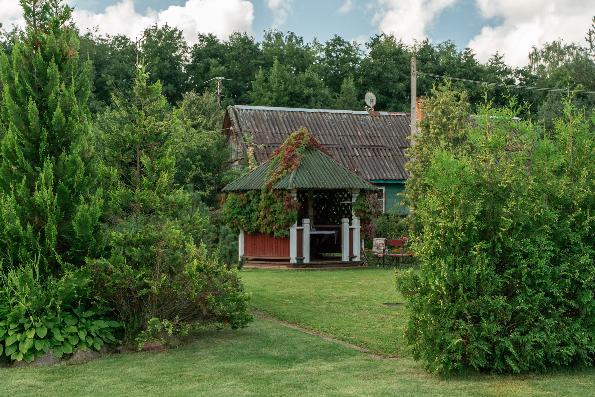Есть баня на дровах для теплых вечеров, теплица для свежих овощей и летняя беседка для чаепития