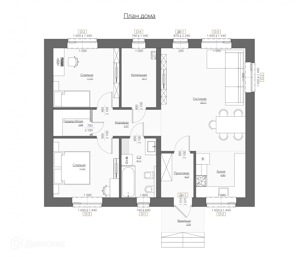 Одноэтажный коттедж, общей площадью 85 м². С двумя изолированными комнатами, большой кухней-гостиной из которой предусмотрен выход на террасу, просторным санузлом и котельной.