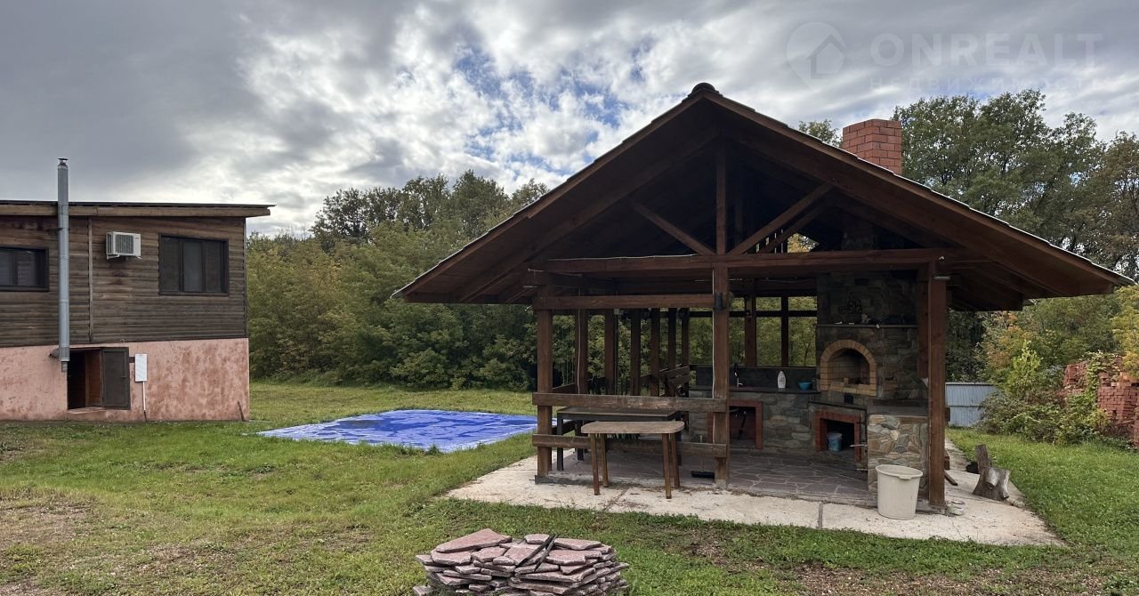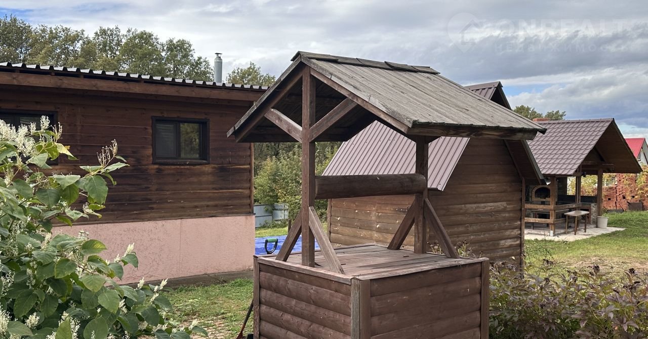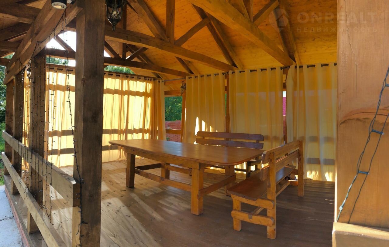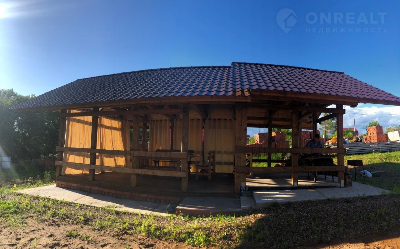 На участке летняя кухня- беседка, сделанная их массива сосны, с печкой-мангалом.
