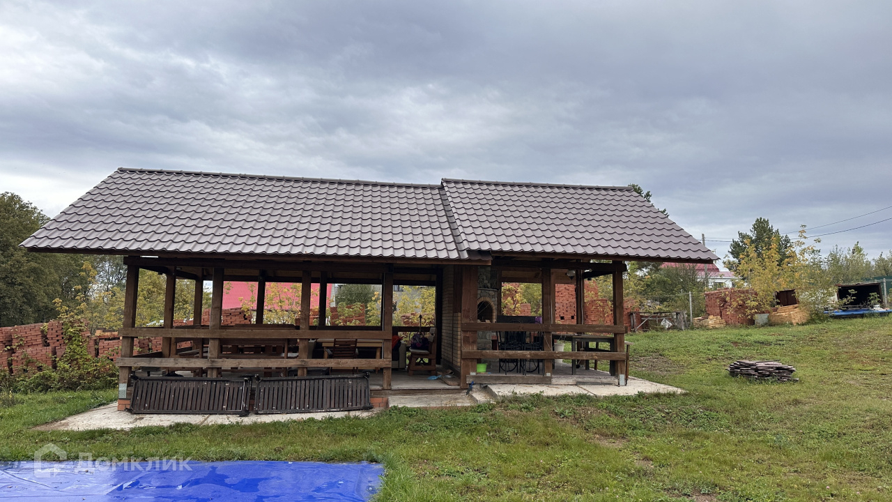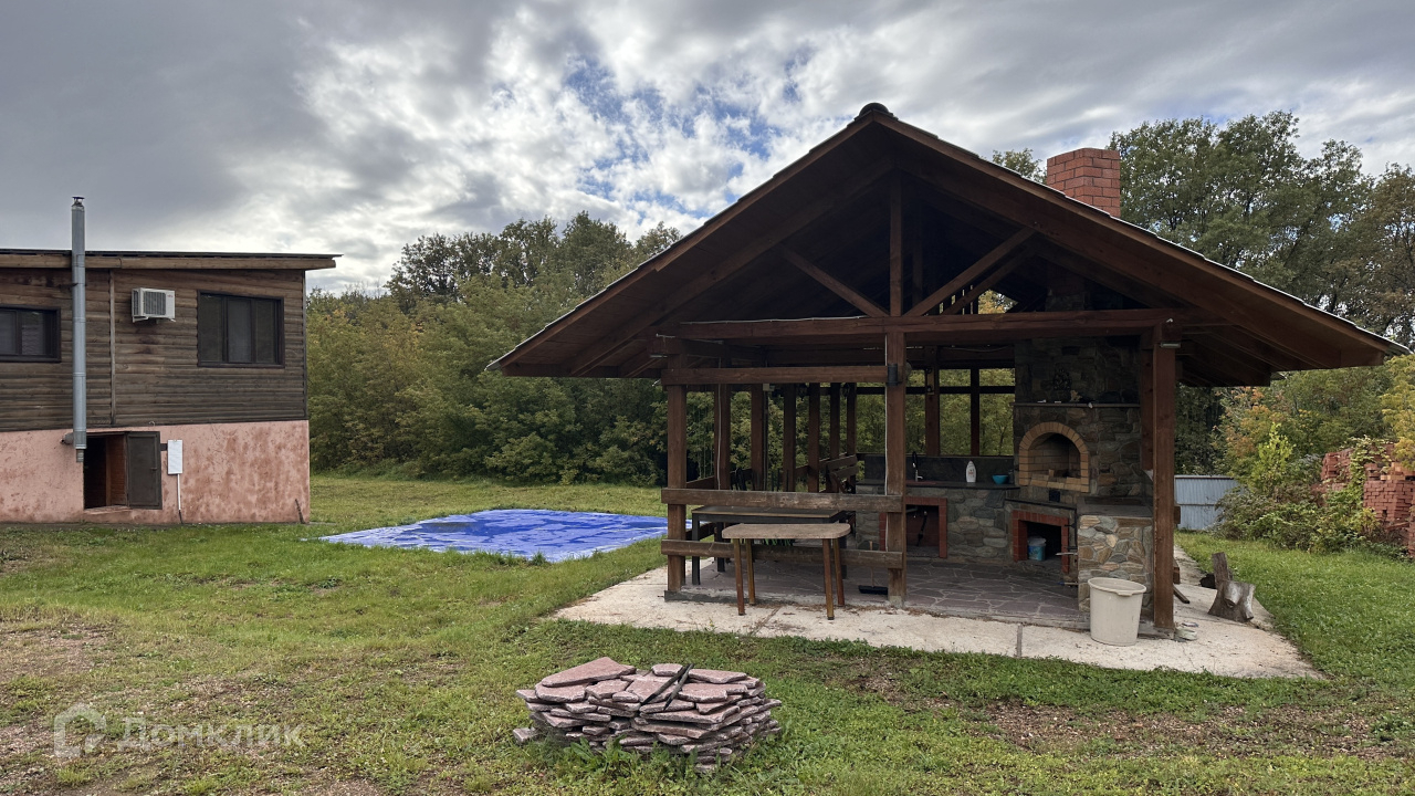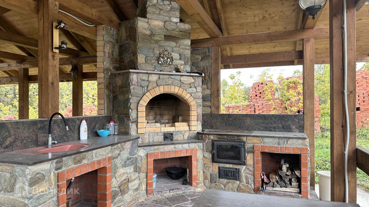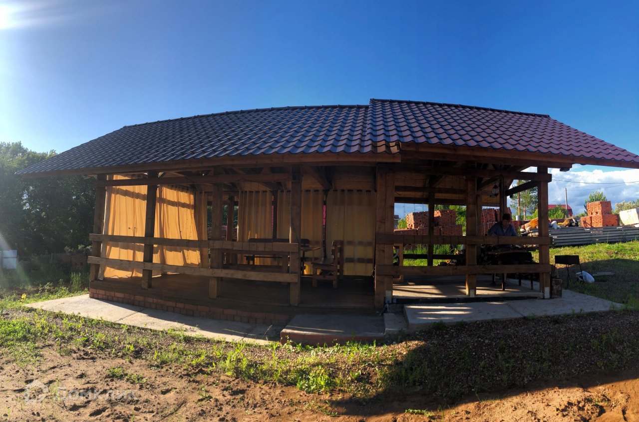 На участке летняя кухня- беседка,  сделанная их массива сосны, с печкой-мангалом.