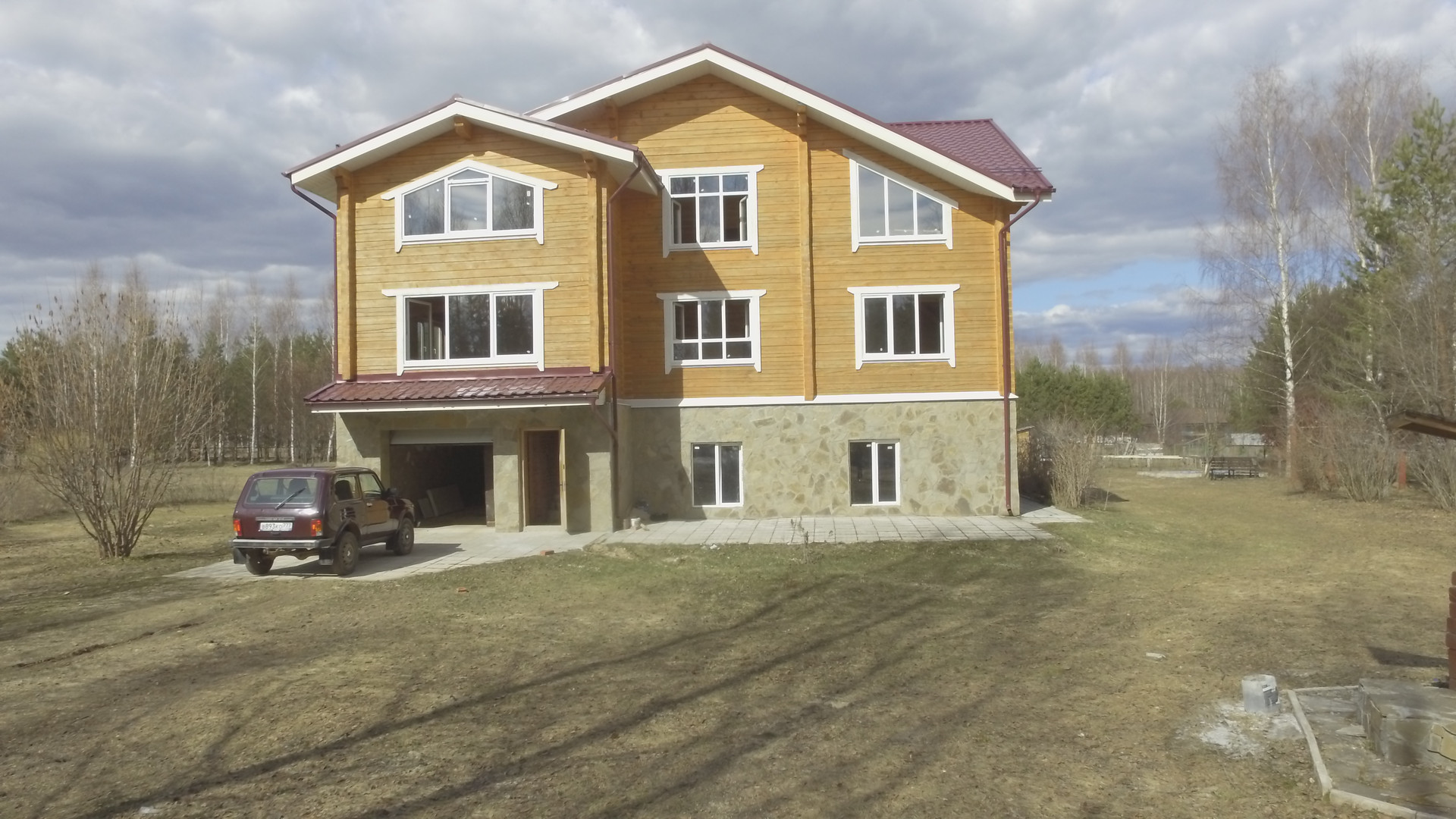 1-й этаж дома: стены построены из бетонных блоков толщиной 70 см и кирпича. Гараж, котельная, сауна и санузел. Окна - стеклопакеты. Высота потолка 4 м: выполнена гидроизоляция и утепление. Фасад обложен диким камнем.
