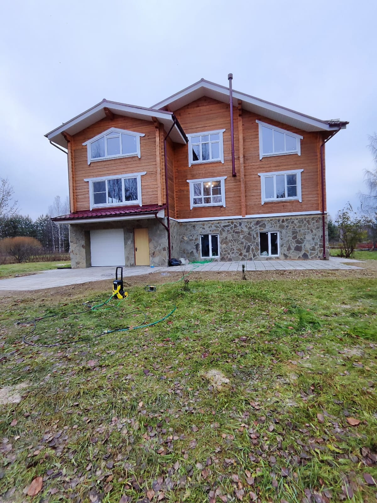 1-й этаж построен из кирпича, облицован камнем;