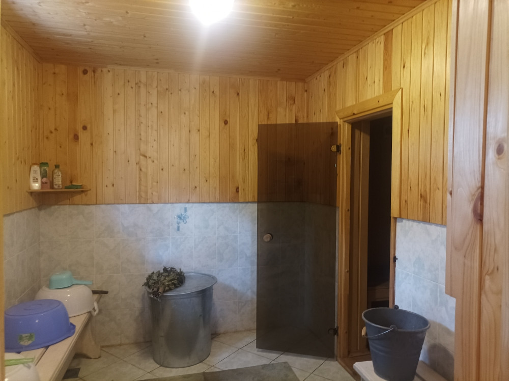 На участке большая баня ( 45 кв.м.) с парной, помывочной, комнатой отдыха с камином. Можно использовать как гостевой дом. И с двух сторон терраса.