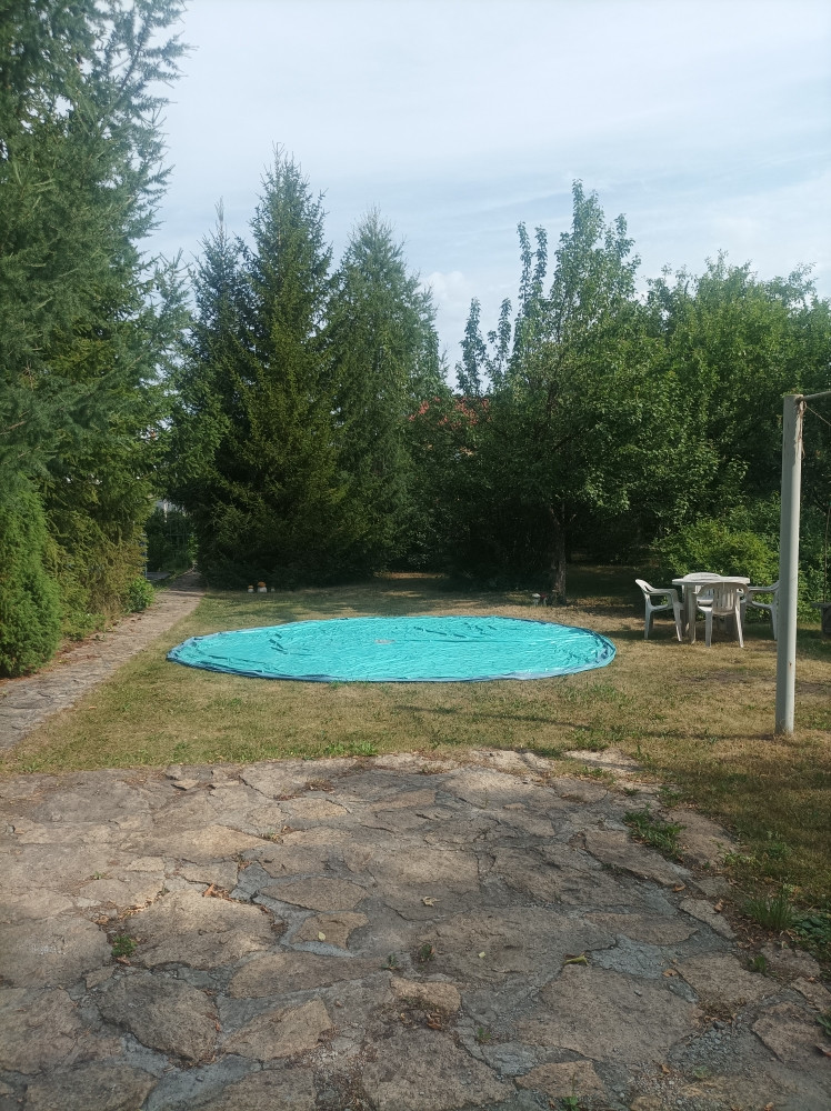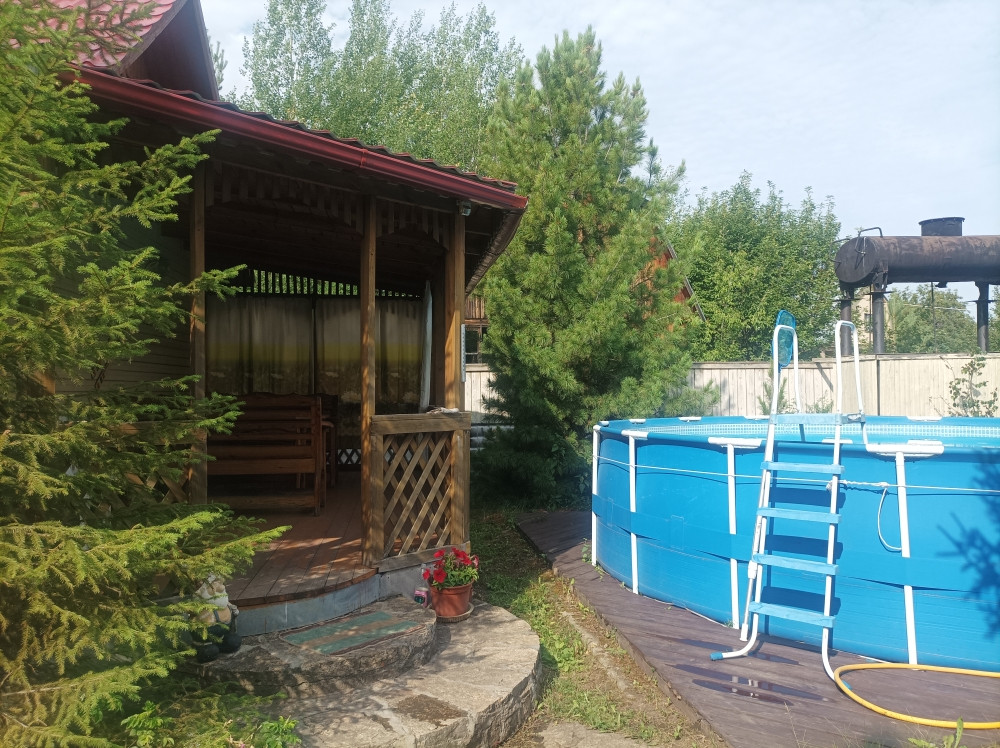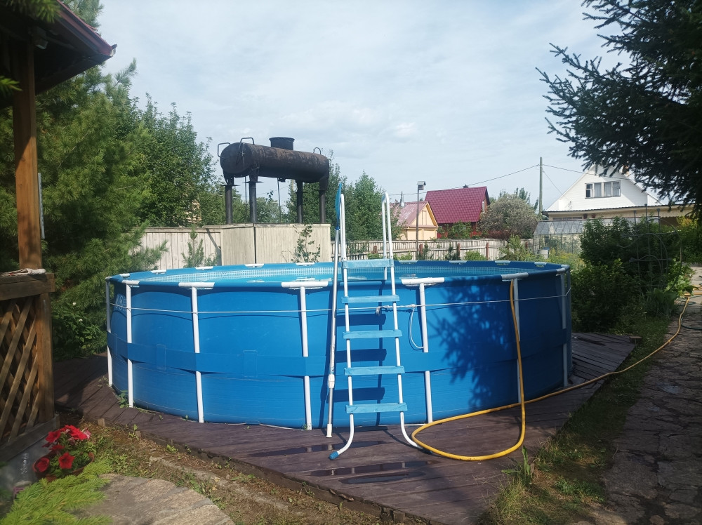 Рядом с баней большой каркасный бассейн.