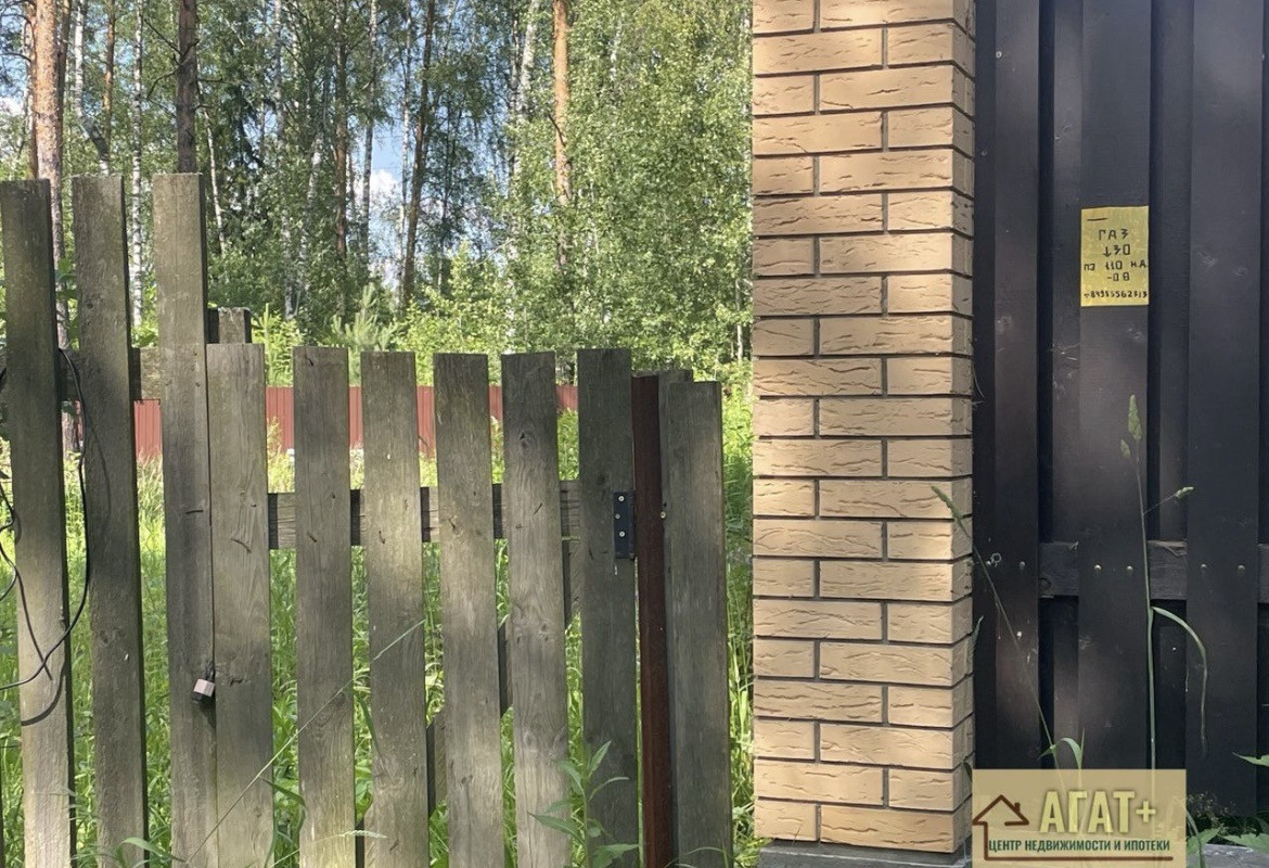 Огорожен по периметру забором с воротами и калиткой: с трех сторон огорожен профлистом, с фасадной стороны забор деревянный. На участке имеются сосны. Магистральный газ и электричество по границе участка. Практ