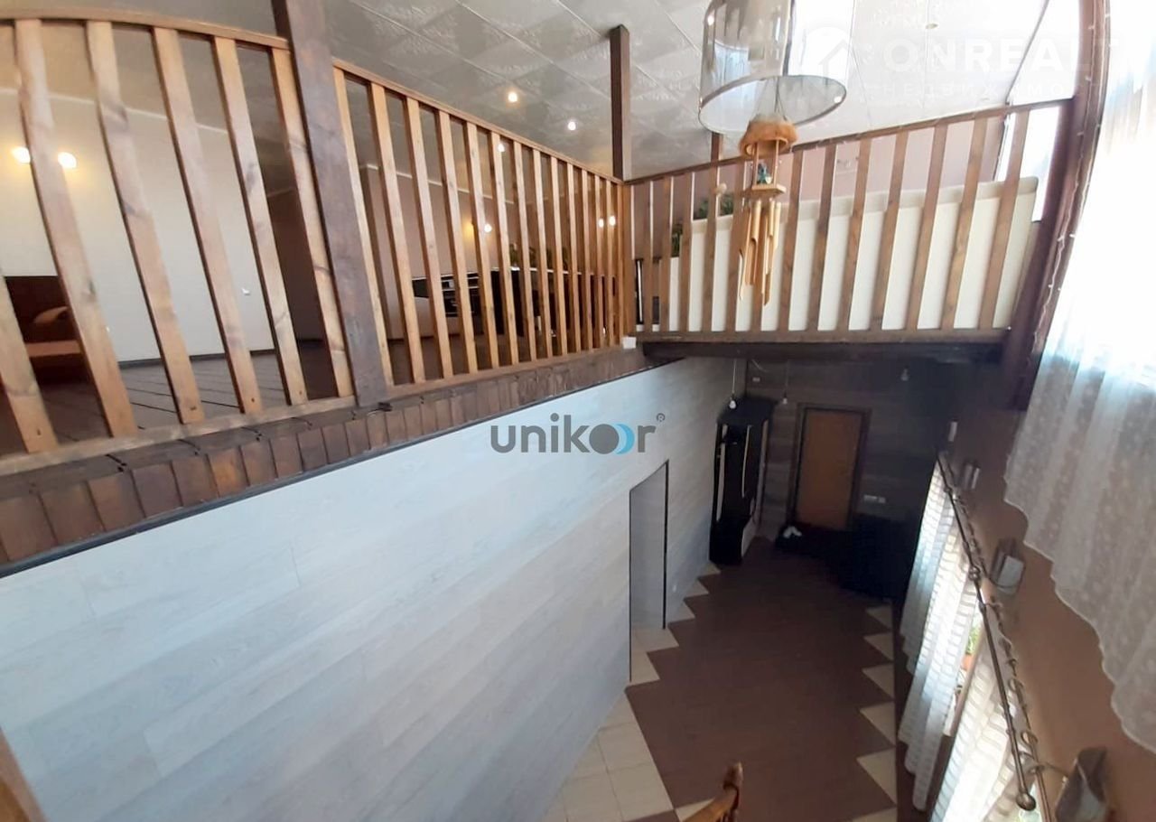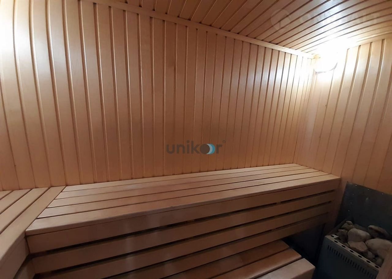 Прихожая, кухня, гостиная на первом и втором этаже, 4 спальни, санузел, сауна, бассейн.