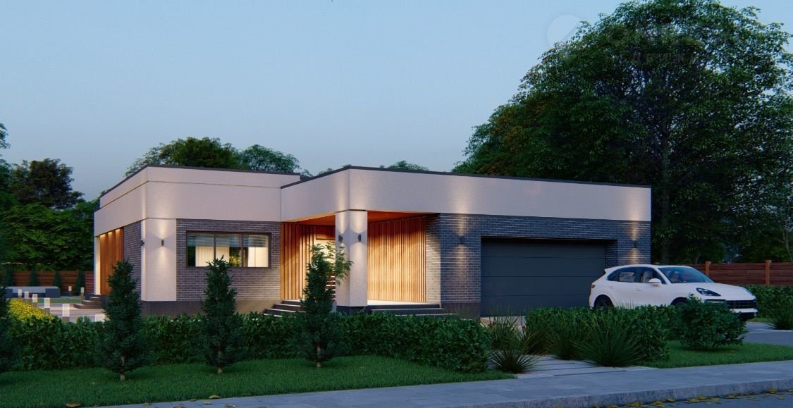 Облицовка фасада планкен из лиственницы, декоративная штукатурка. Установлены фасадные светильники.