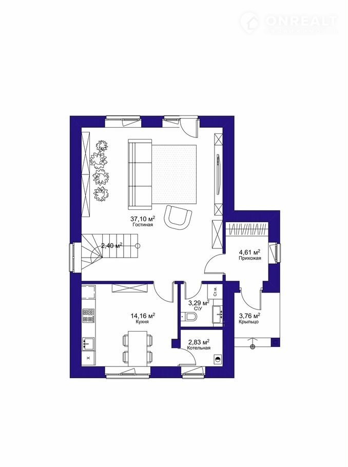 - на 1 этаже: просторная гостиная с выходом на задний двор, большая кухня, гостевой с/у и ванная, котельная, прихожая;