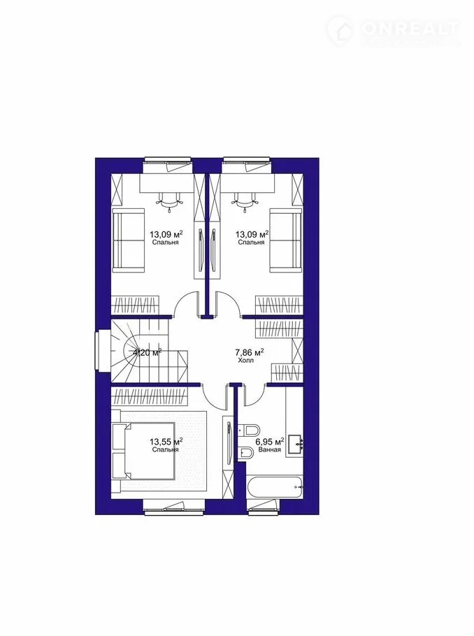 - на 2 этаже: 3 спальные комнаты, ванная и холл.