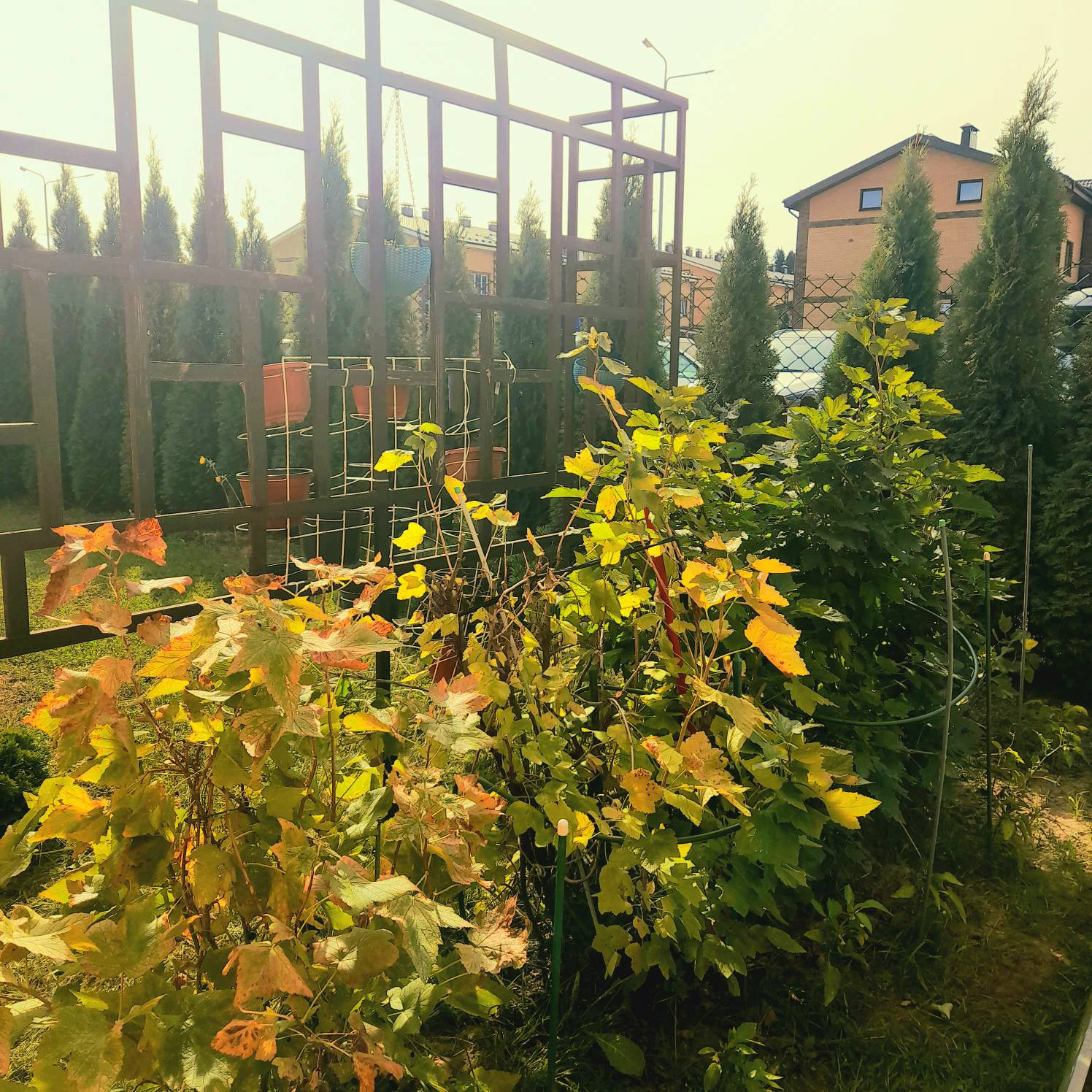 Зона огорода(3 грядки и 3 бочки с черноземом для посадок, культурный виноград)отгорожена от газона перголой.