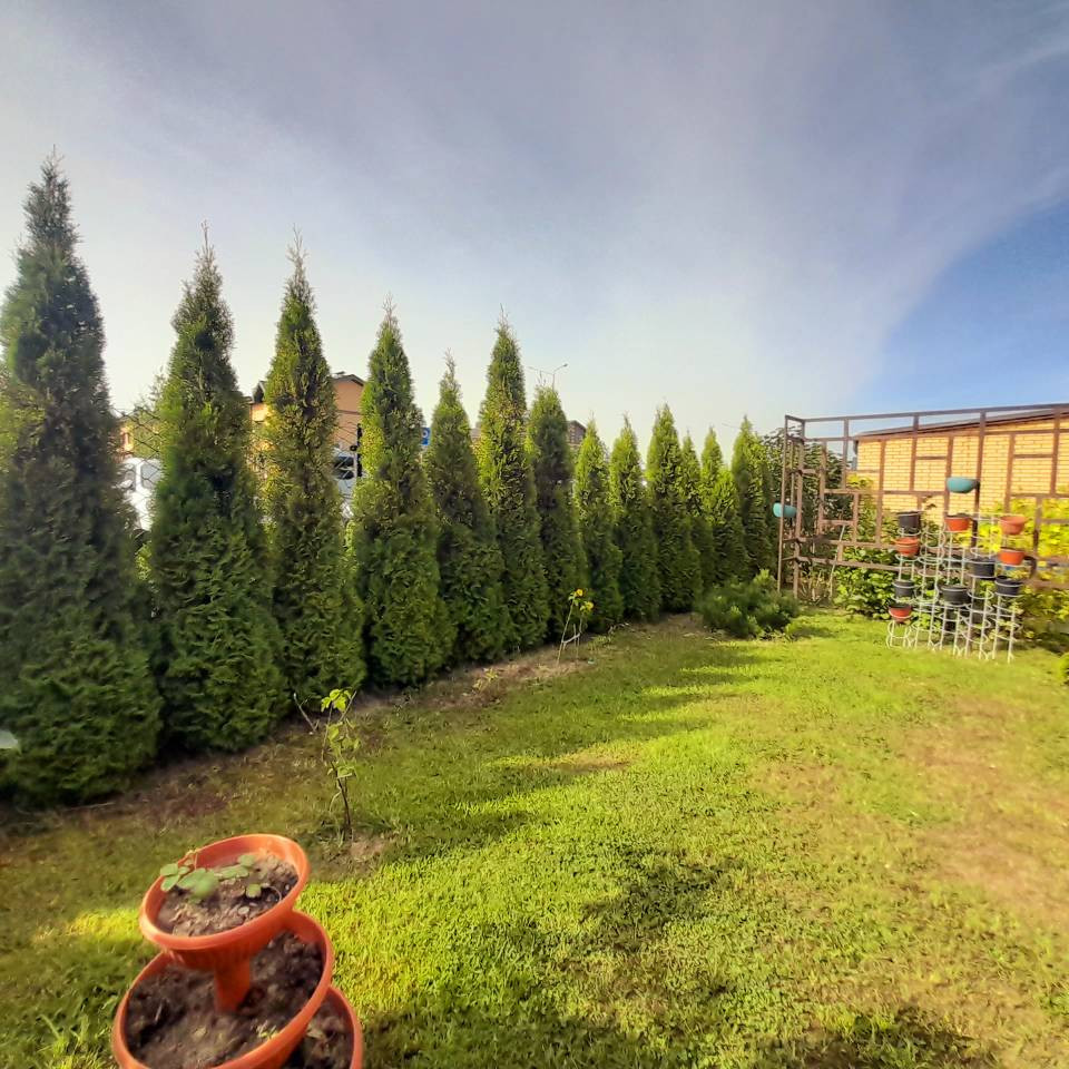 Участок обсажен туями.Яблони (очень вкусные и крупные яблоки), красная, черная смородина, малина, кедр, 3 декор. хвойных кустарника.