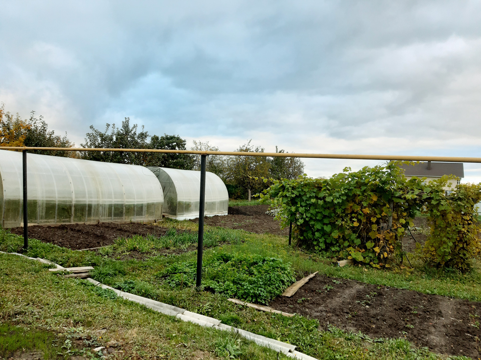 В огороде — две теплицы из поликарбоната, яблони, груши, смородина красная, черная, вишни, плантация клубники, виноград.