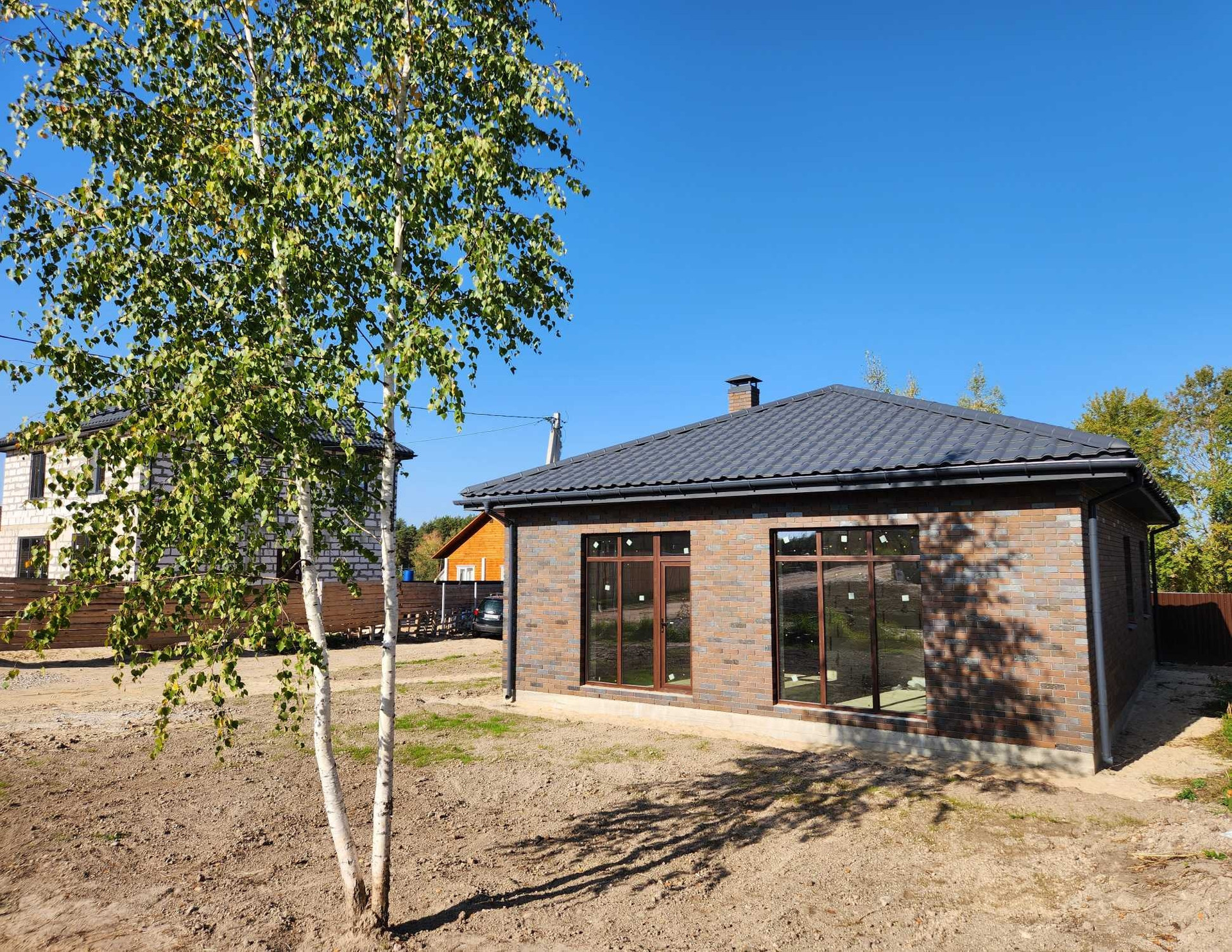 В доме просторная кухня-гостинная 30 метров, два санузла, три спальни.
