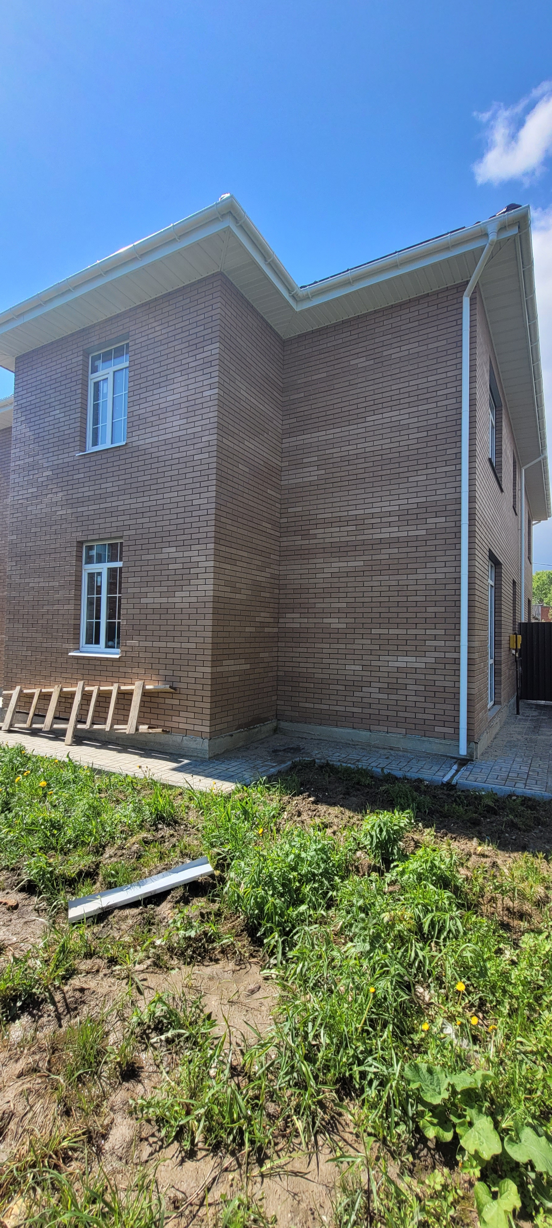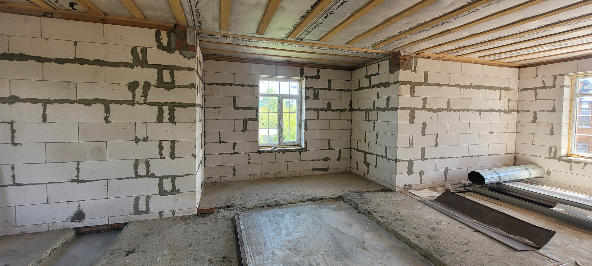 Построен из блоков, обложен кирпичом.