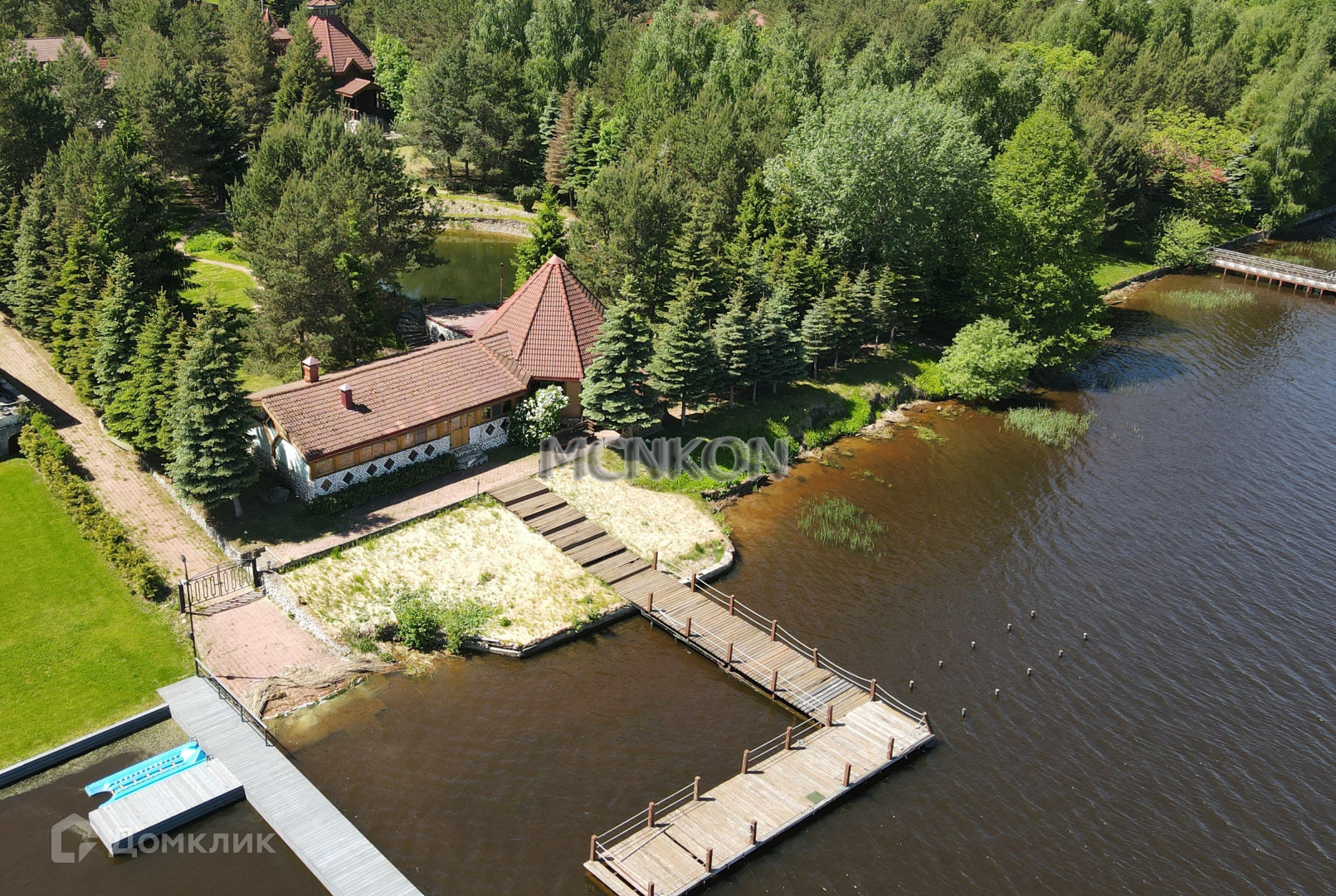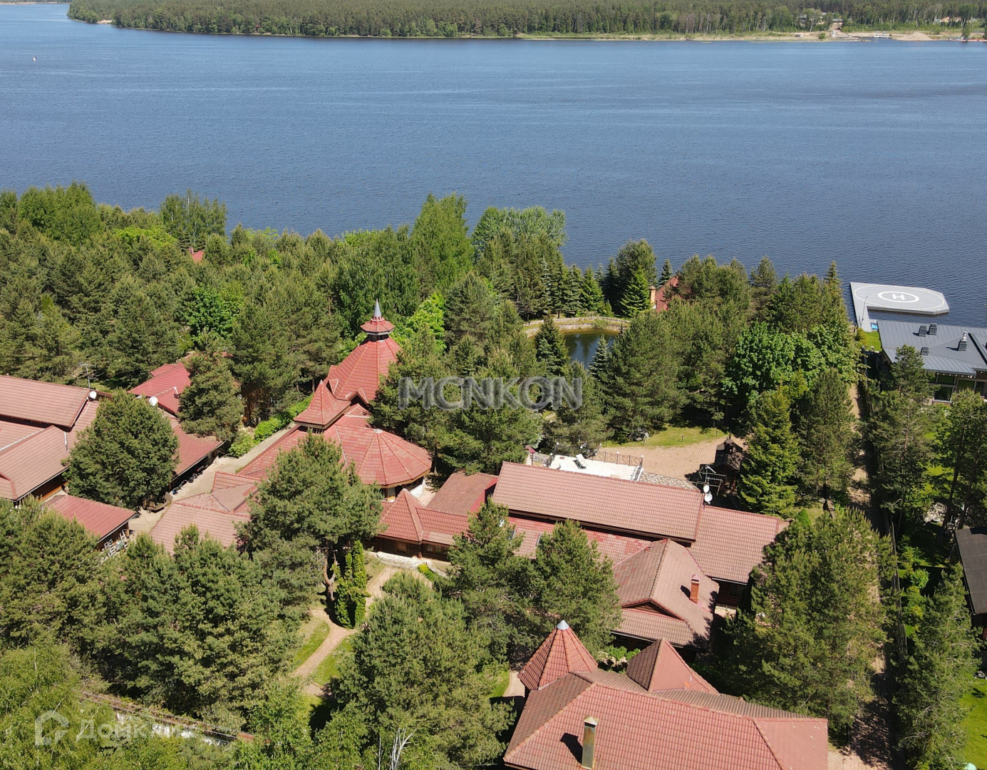 На участке расположен основной дом 800 м2, дом (для персонала) 400м2, баня 200м2, летний дом 400м2, бассейн (не достроен). Свой причал, пруд.