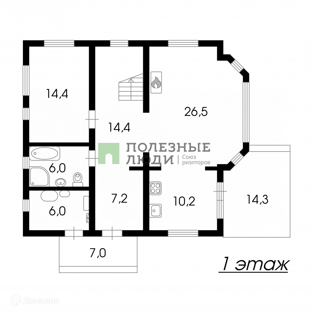 - На первом этаже расположены: кухня-гостиная, ванная комната, спальня, прихожая;
