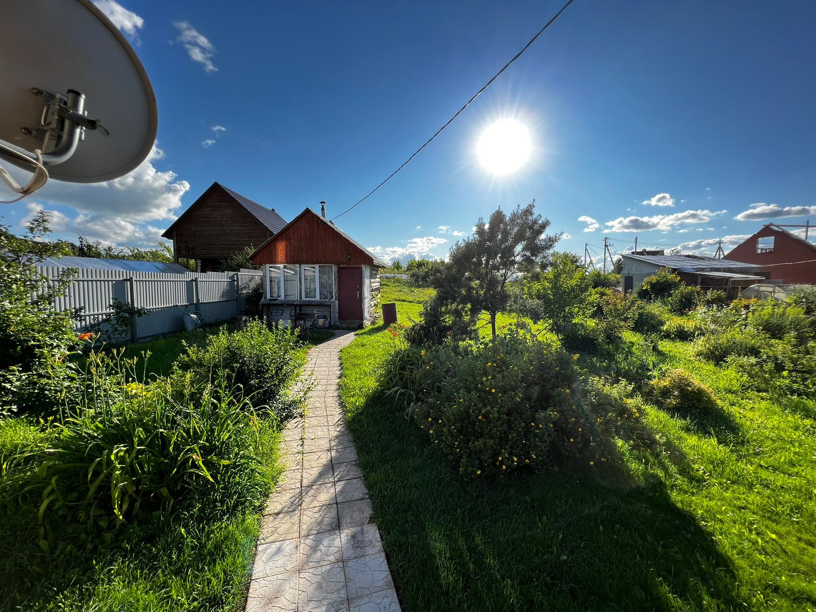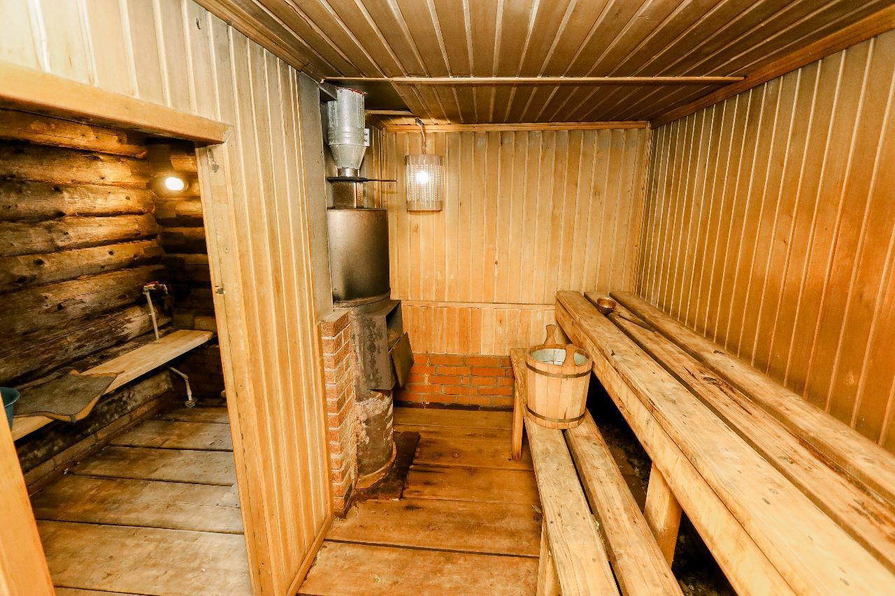 Дом расположен в передней части земельного участка площадью 11 соток, за которым располагаются плодоносные посадки и баня общей площадью 36 кв. м.