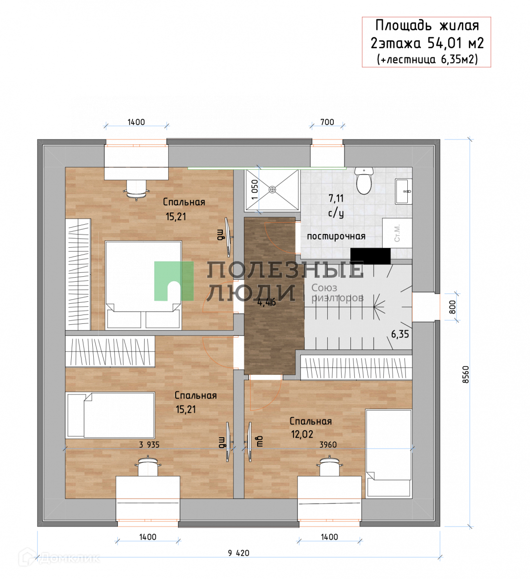 Планировка классическая: на первом этаже кухня-гостиная, сан.узел и кабинет, на втором этаже 3 спальни и ванная комната
