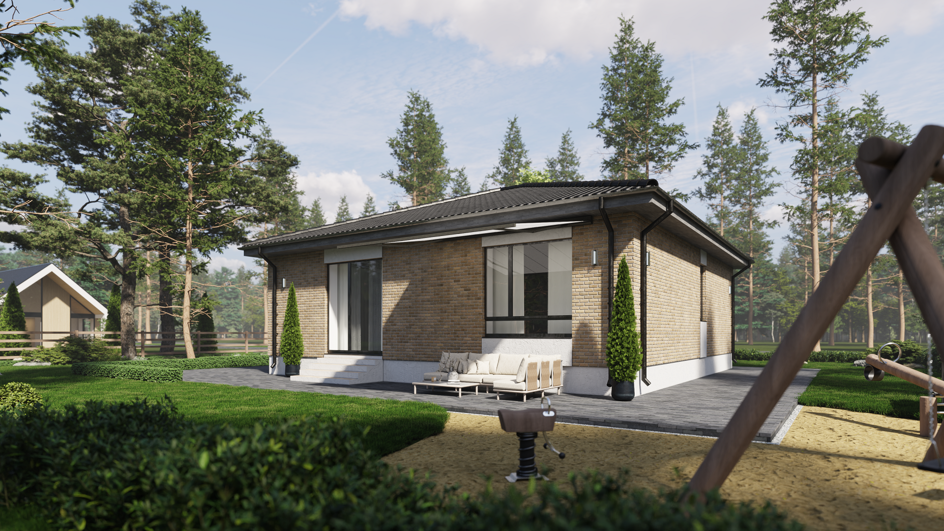 Удобная панировка с огромной кухней-гостиной на 30,5кв.м с выходом  во двор. С просторными спальнями. Два санузла. В котельной место для прачечной, а на входе выделено гардеробное место. Уютное крыльцо под крышей дома.