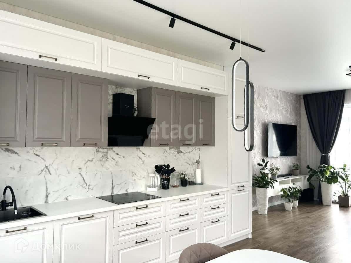 Кухня-гостиная 32 м2 с новым кухонным гарнитуром со встроенной техникой .