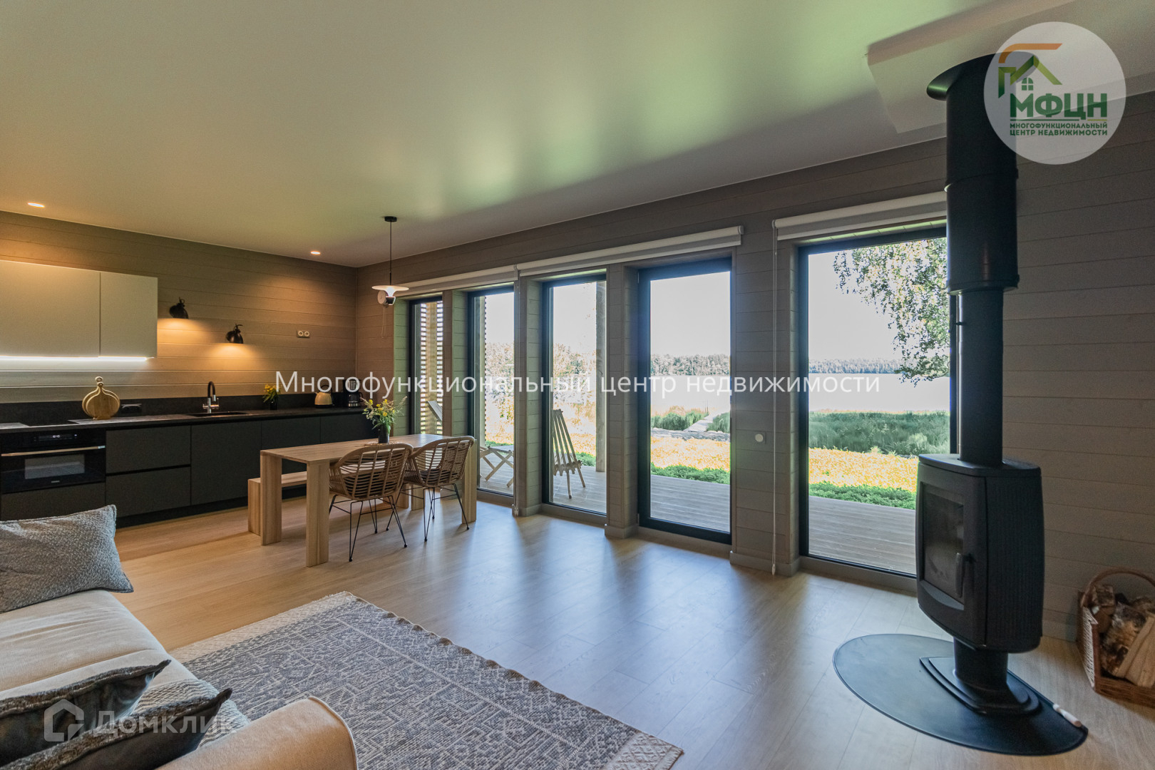 * Просторная кухня-гостиная (32 м²) с камином для создания уютной атмосферы.