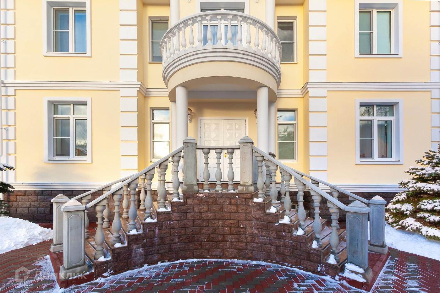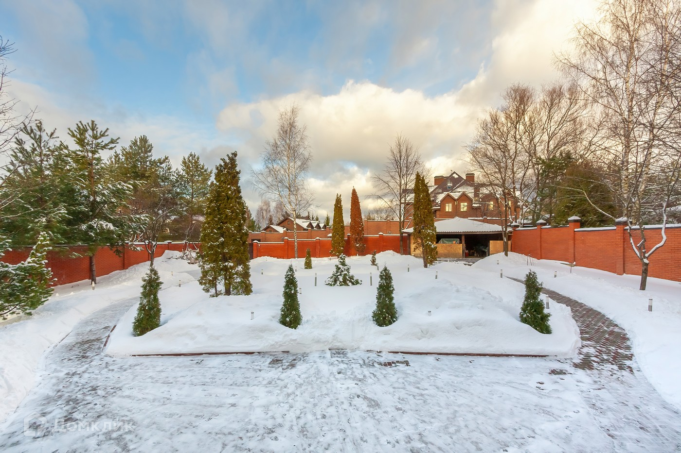 сделан из кирпича, расположен на участке правильной формы с плодовыми деревьями.