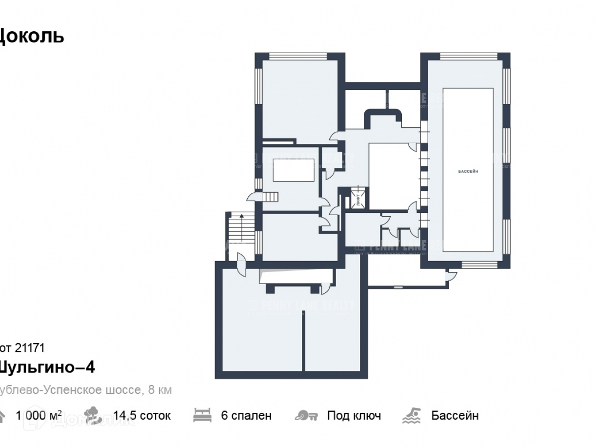 Цоколь: бассейн, зона отдыха, 2 с/у, душевая, сауна, спортзал, простиранная-гладильная, котельная, холодная комната.