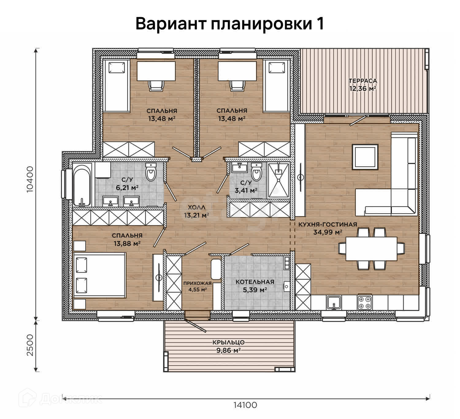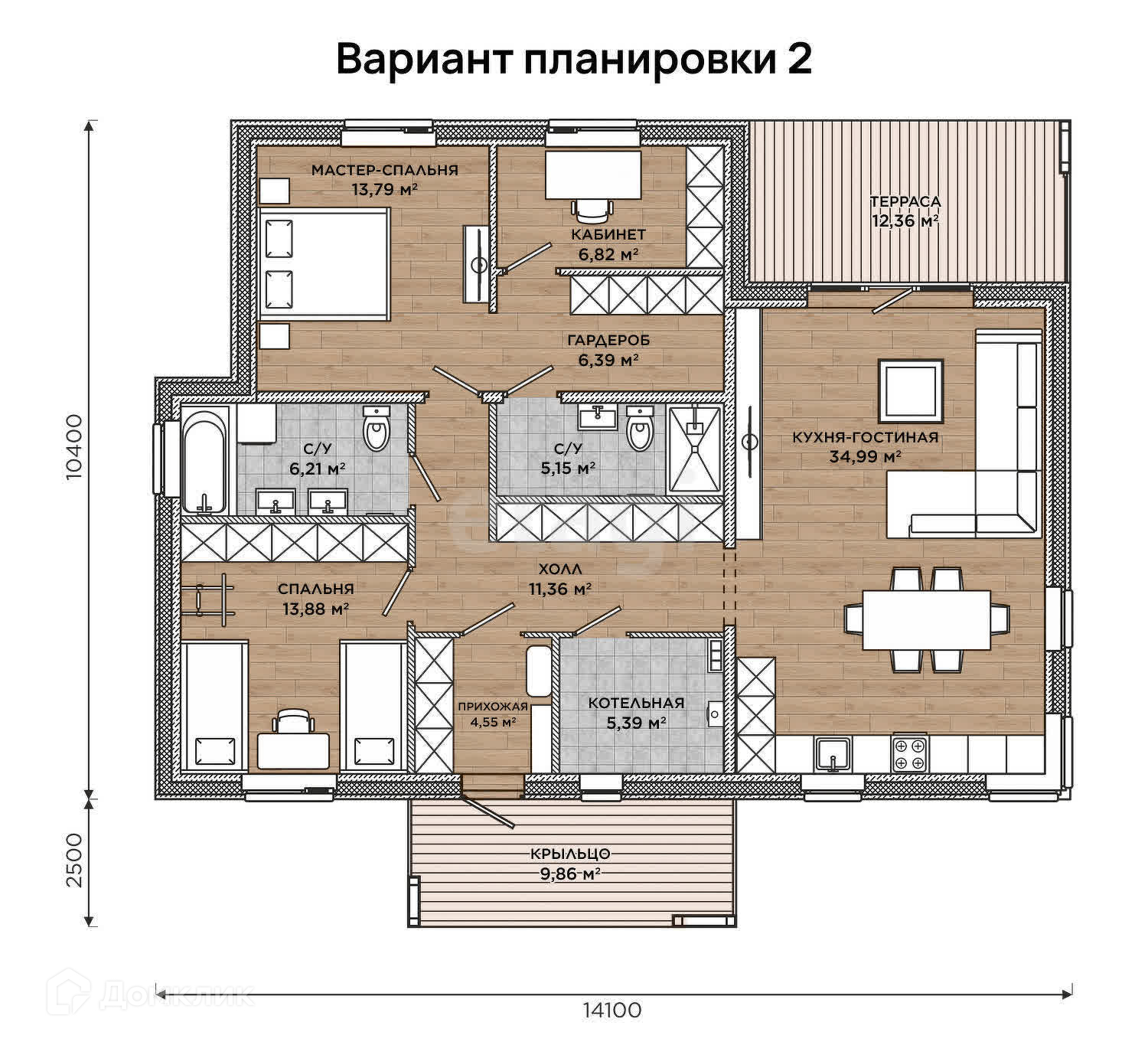 В доме два санузла, вход в которые не просматривается из гостиной. Также в доме предусмотрена котельная под газовое отопление, попасть в которую можно из холла.