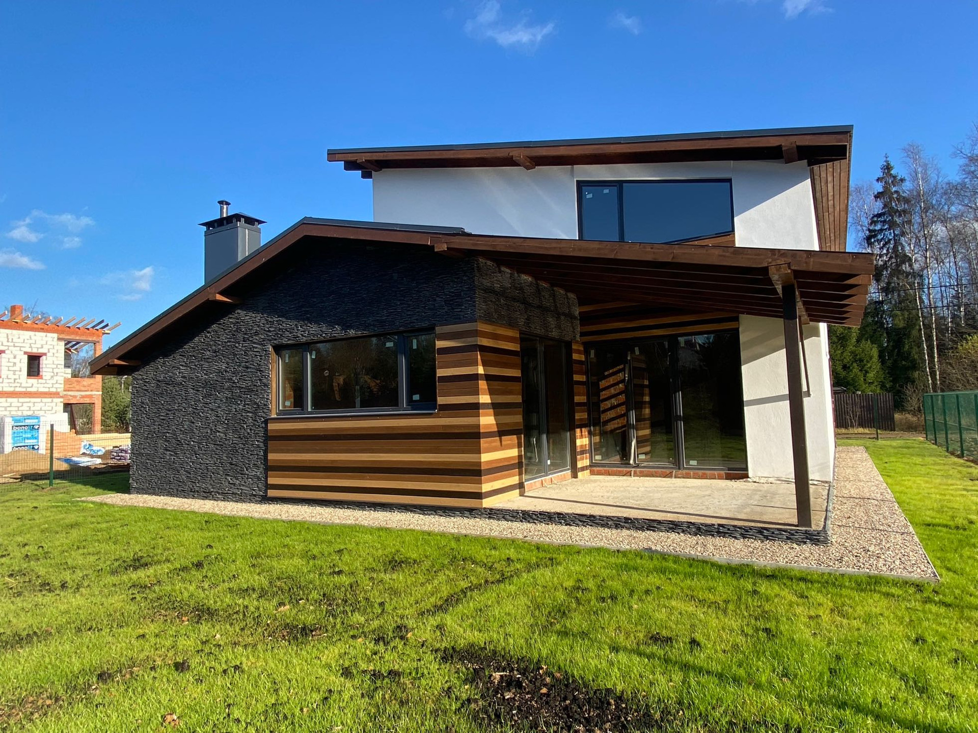 При строительстве дома особое внимание уделили экологичности используемых материалов. Применена технология монолитно - кирпичной постройки с железобетонным монолитным перекрытием. Дом отделан планкеном из лиственницы, диким камнем и декоративной штукатуркой.  Комбинация камня, дерева и стекла формирует стиль современного уютного дома. Выдержана четкая геометрия форм.