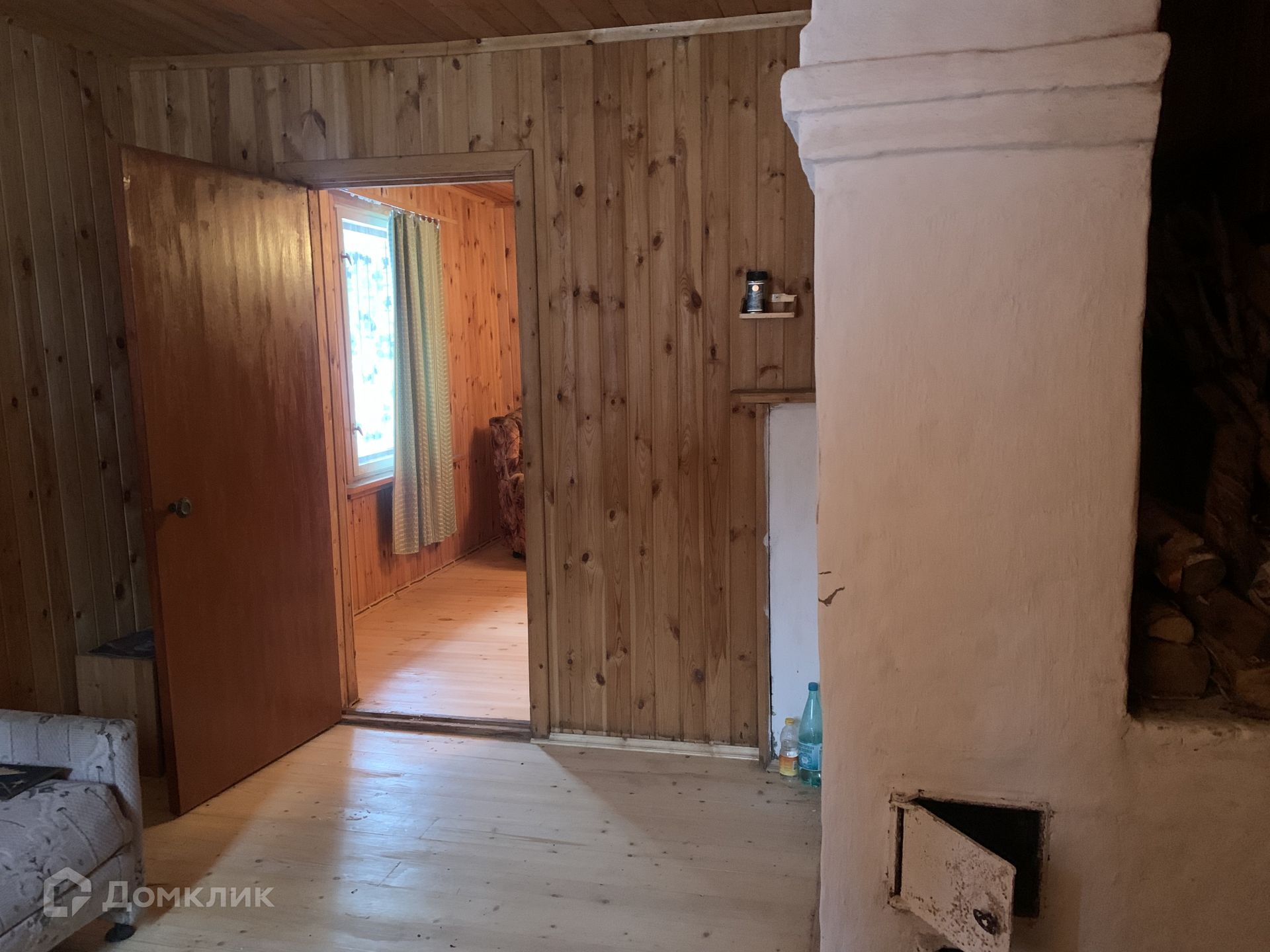 В доме два этажа. На первом этаже есть печь и камин, прихожая, кухня и гостиная, санузел.