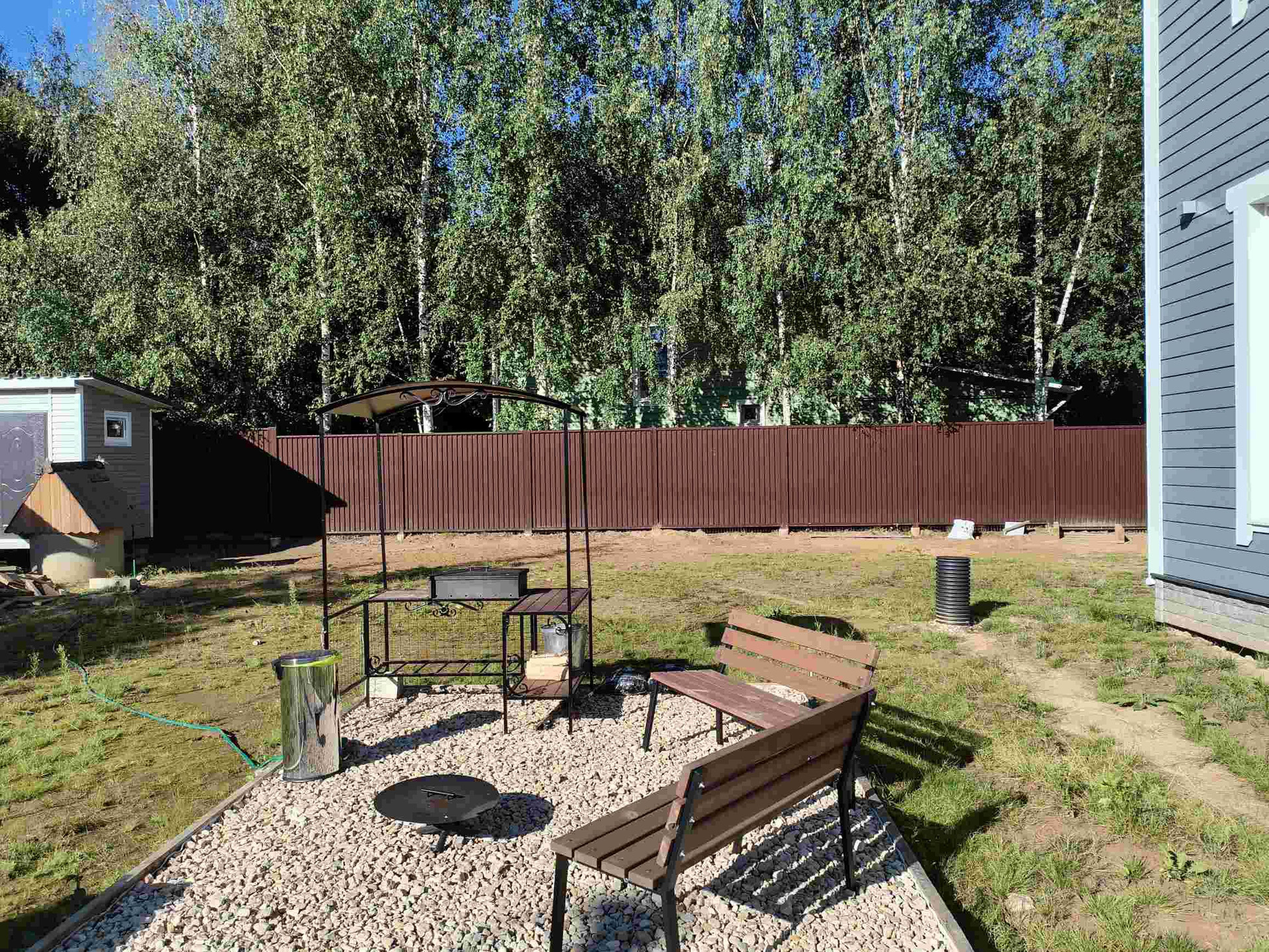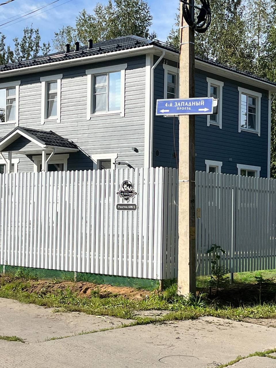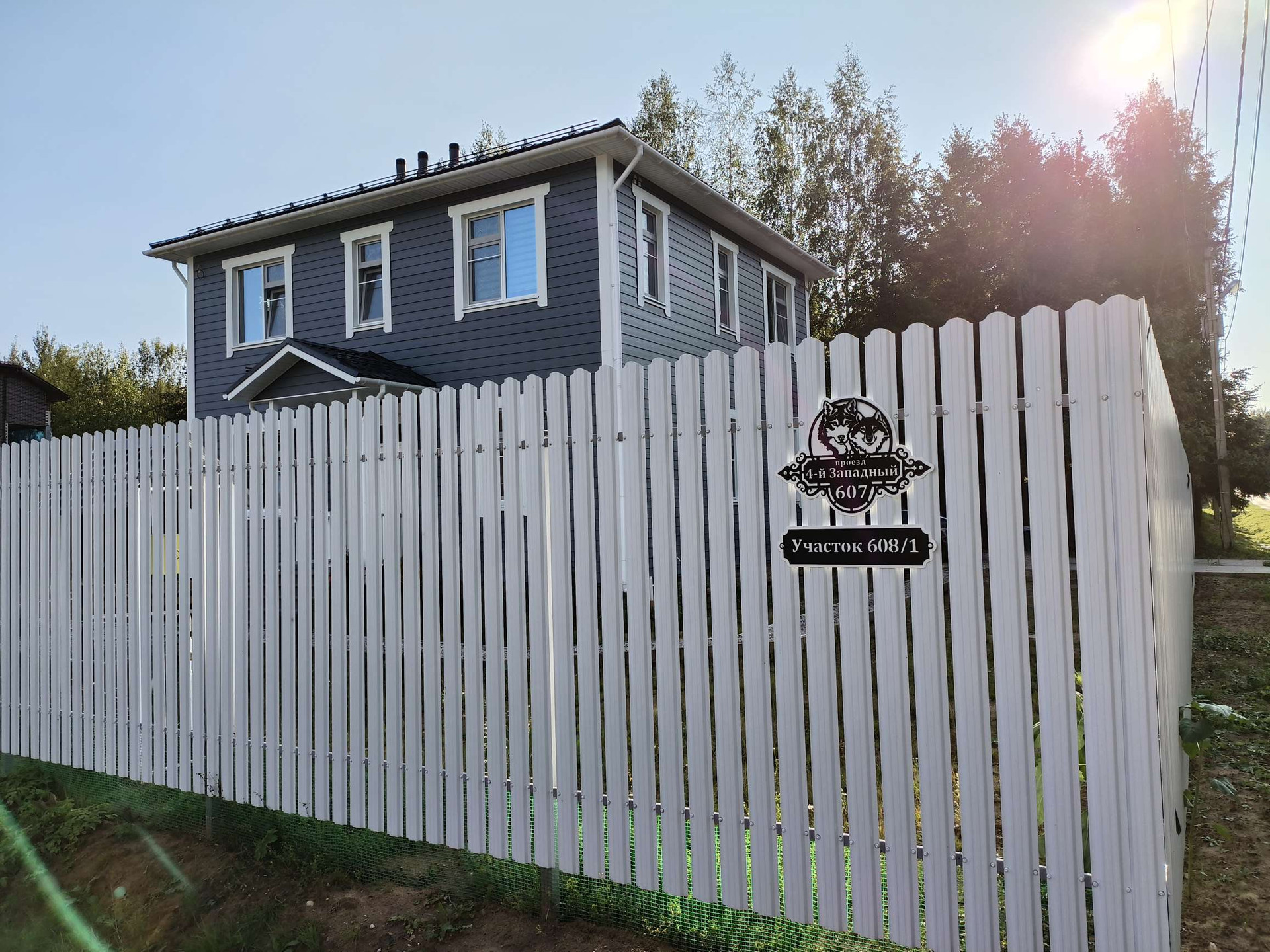 Участок 9,4 сотки, огорожен красивым белым забором из металлического штакетника. Откатные ворота с электроприводом. В планах было по бокам от входа в дом посадить два высоких дерева, которые бы закончили красивую картину: белый штакетник, красивая белая дверь, серебристосерый сайдинг, белые наличники окон, и два дерева на фоне голубого неба... Но с благоустройством, к сожалению, не успел. Во дворе временные дорожки из щебенки, щебеночная парковка и зона отдыха. Вокруг дома имеется дренаж. Есть хоз. уголок: дровник, колодец и сарай.