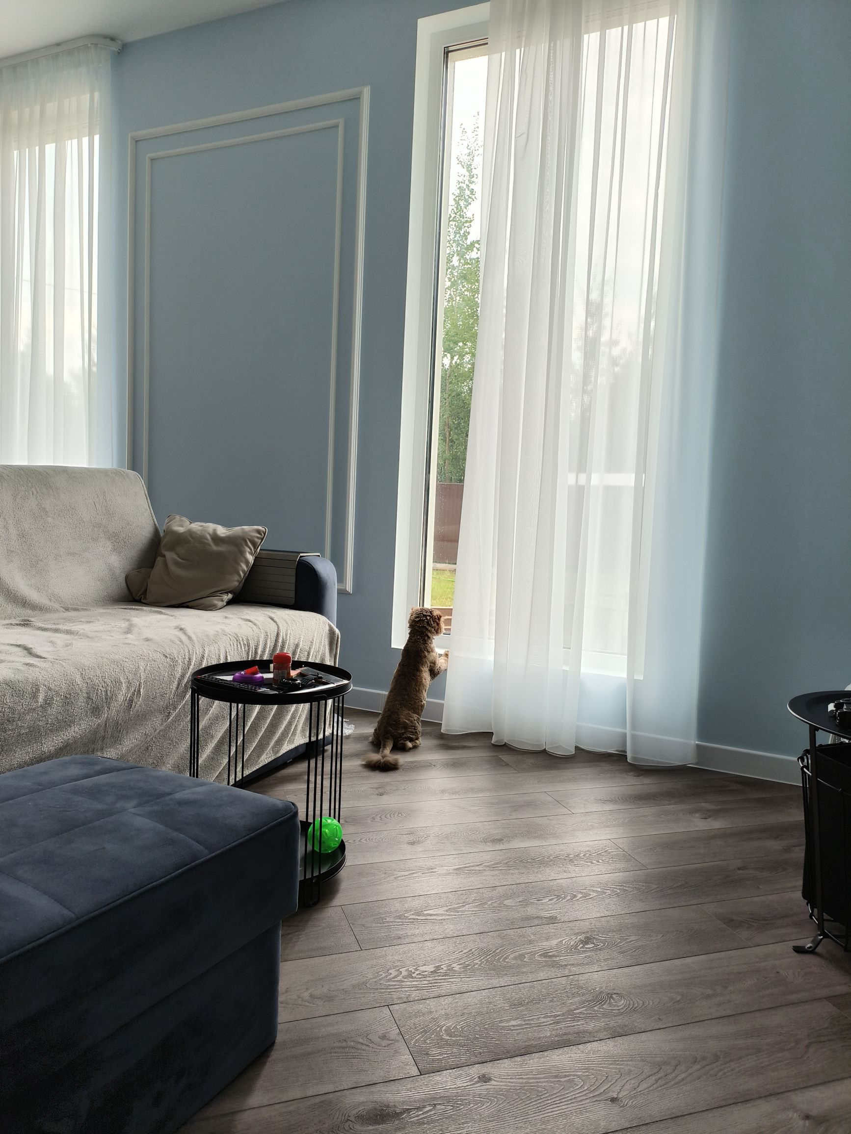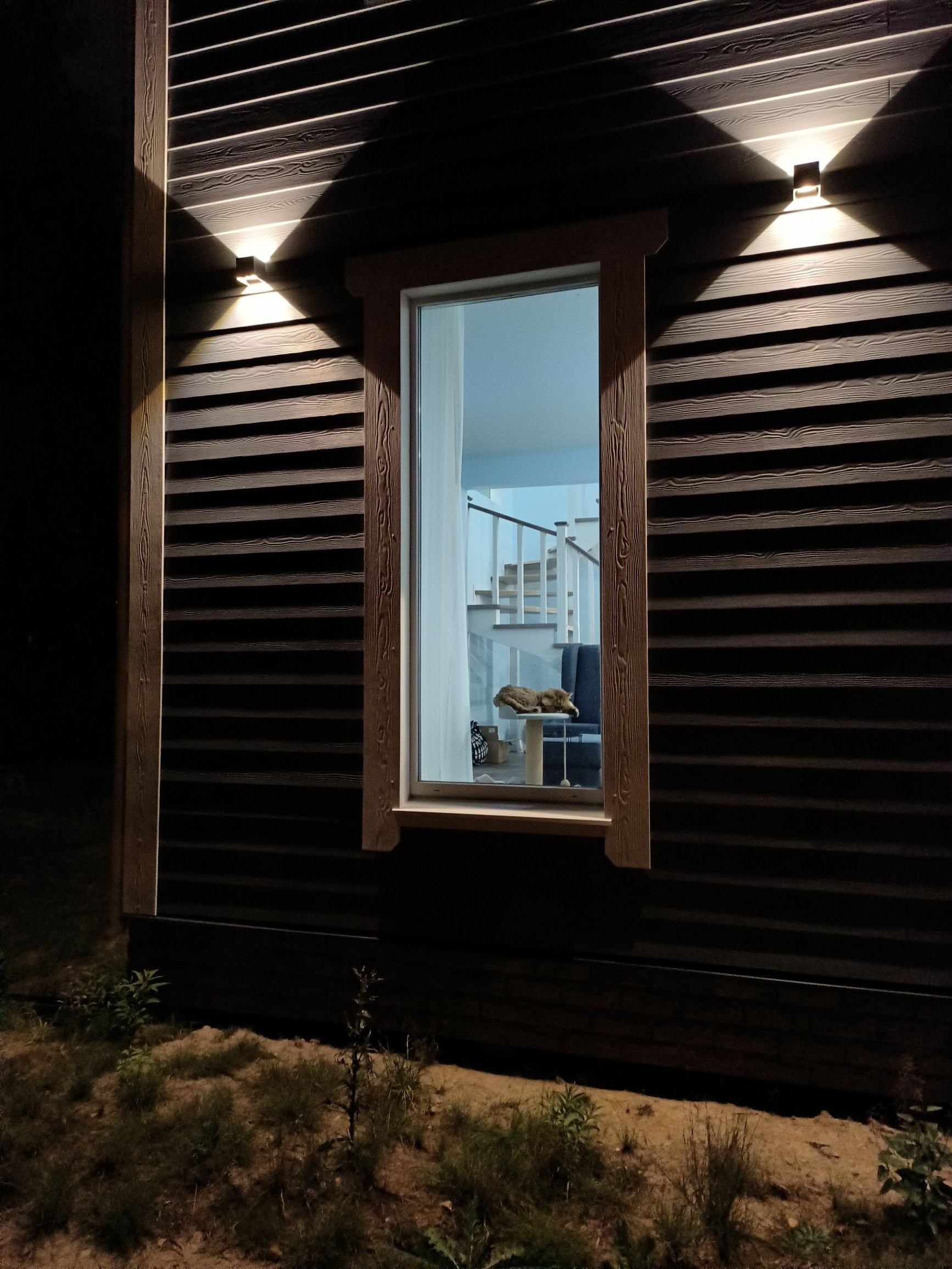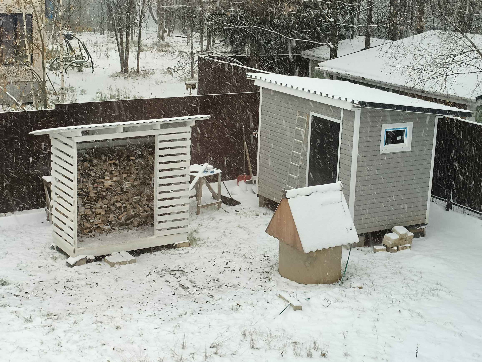 Участок 9,4 сотки, огорожен красивым белым забором из металлического штакетника. Откатные ворота с электроприводом. В планах было по бокам от входа в дом посадить два высоких дерева, которые бы закончили красивую картину: белый штакетник, красивая белая дверь, серебристосерый сайдинг, белые наличники окон, и два дерева на фоне голубого неба... Но с благоустройством, к сожалению, не успел. Во дворе временные дорожки из щебенки, щебеночная парковка и зона отдыха. Вокруг дома имеется дренаж. Есть хоз. уголок: дровник, колодец и сарай.