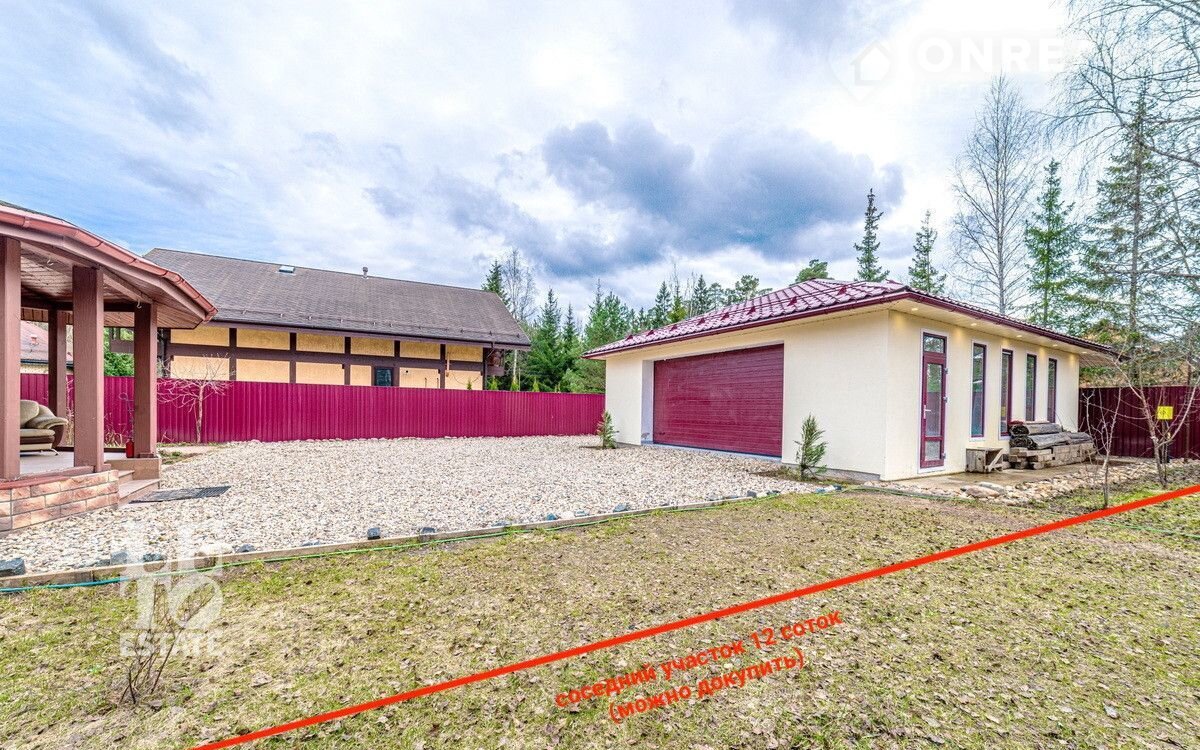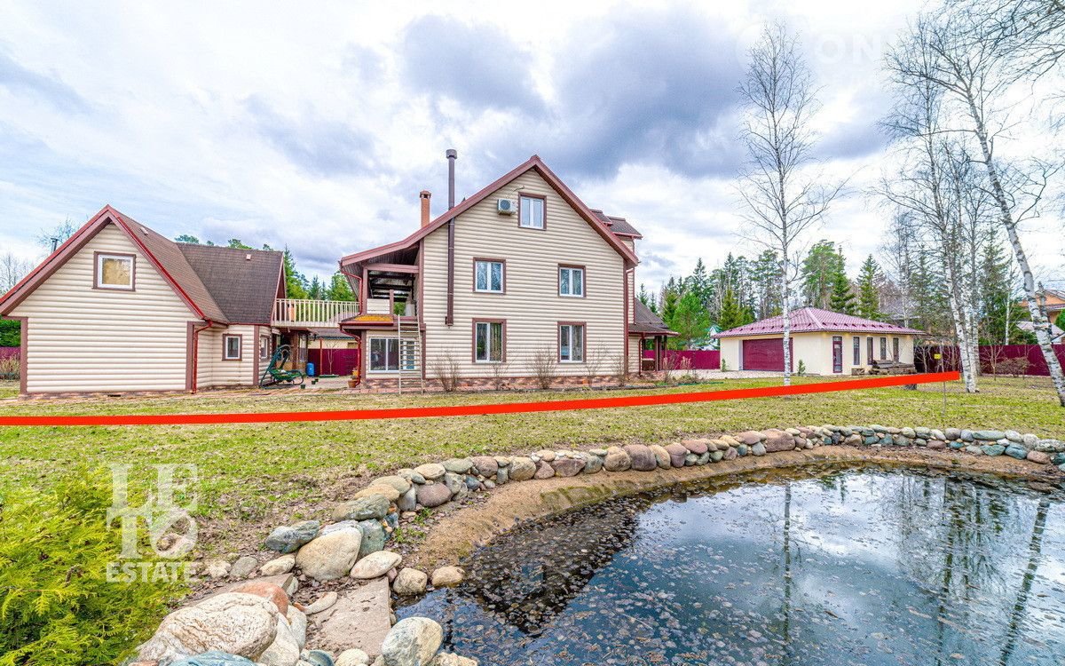 На просторном участке 12 соток выполнен ландшафтный дизайн, сделан дренаж, высажен газон, организован небольшой пруд. Есть просторная мангальная зона, отдельно стоящая баня, теплый гараж на два автомобиля и дополнительно парковка перед домом.