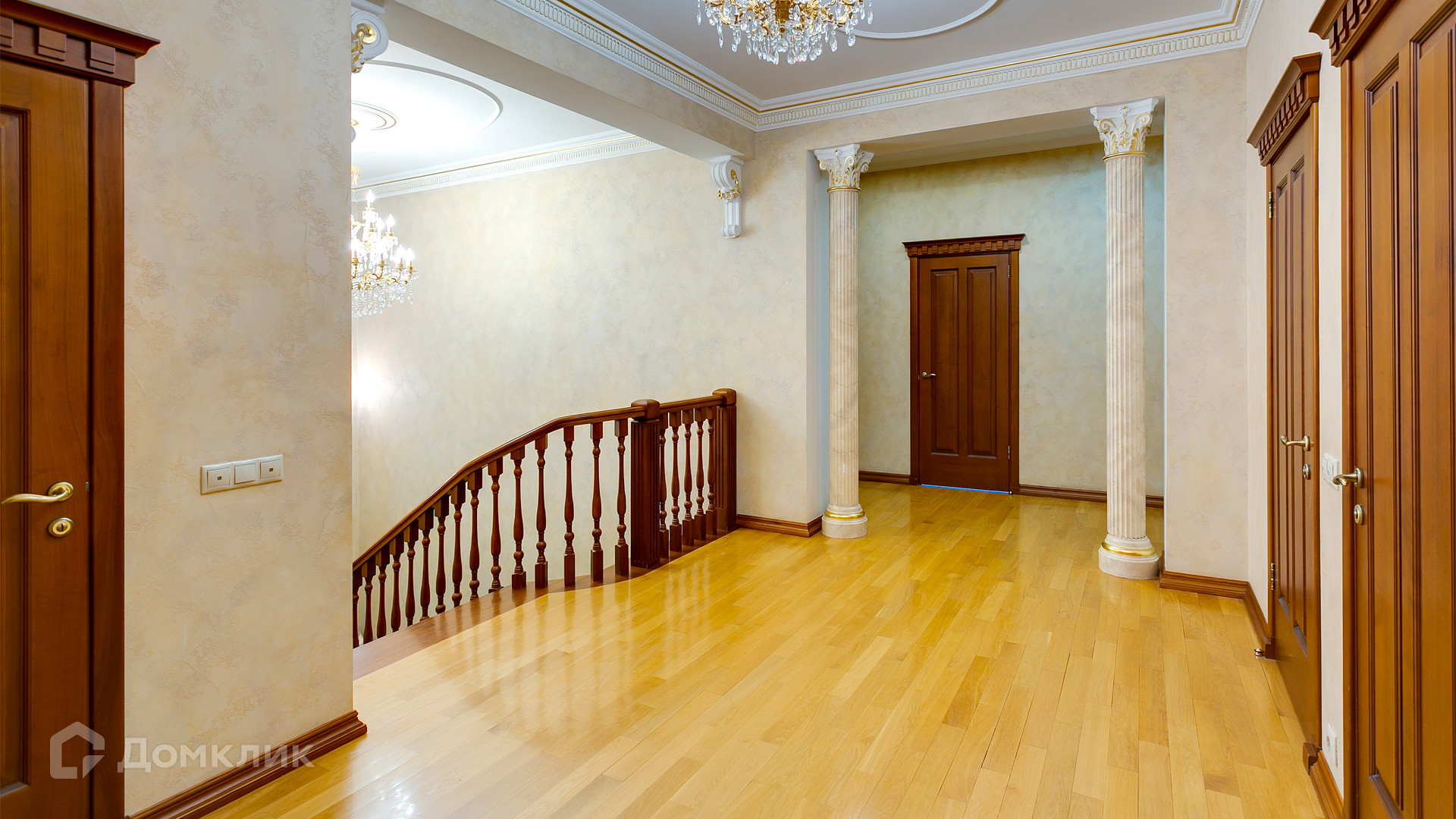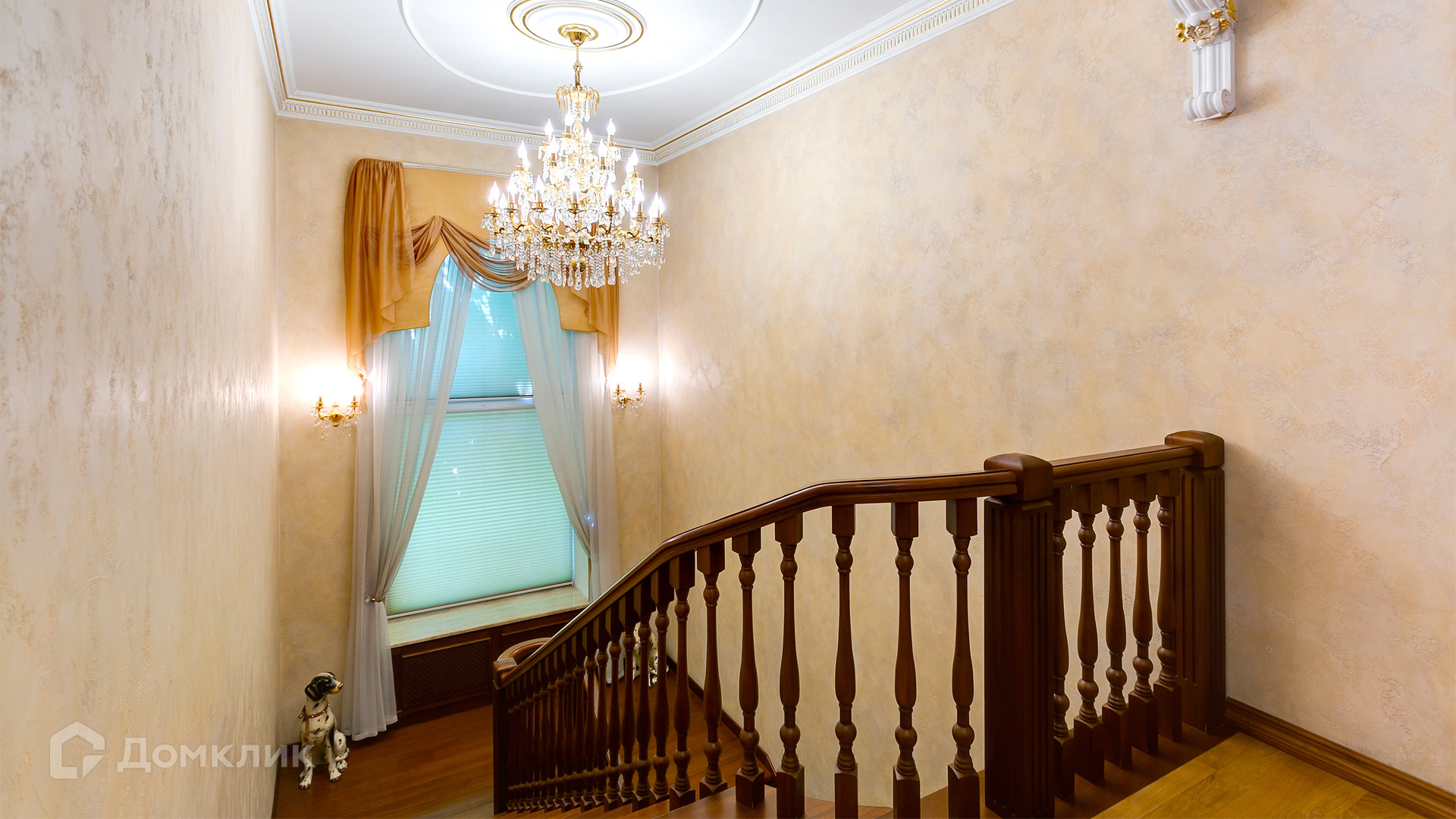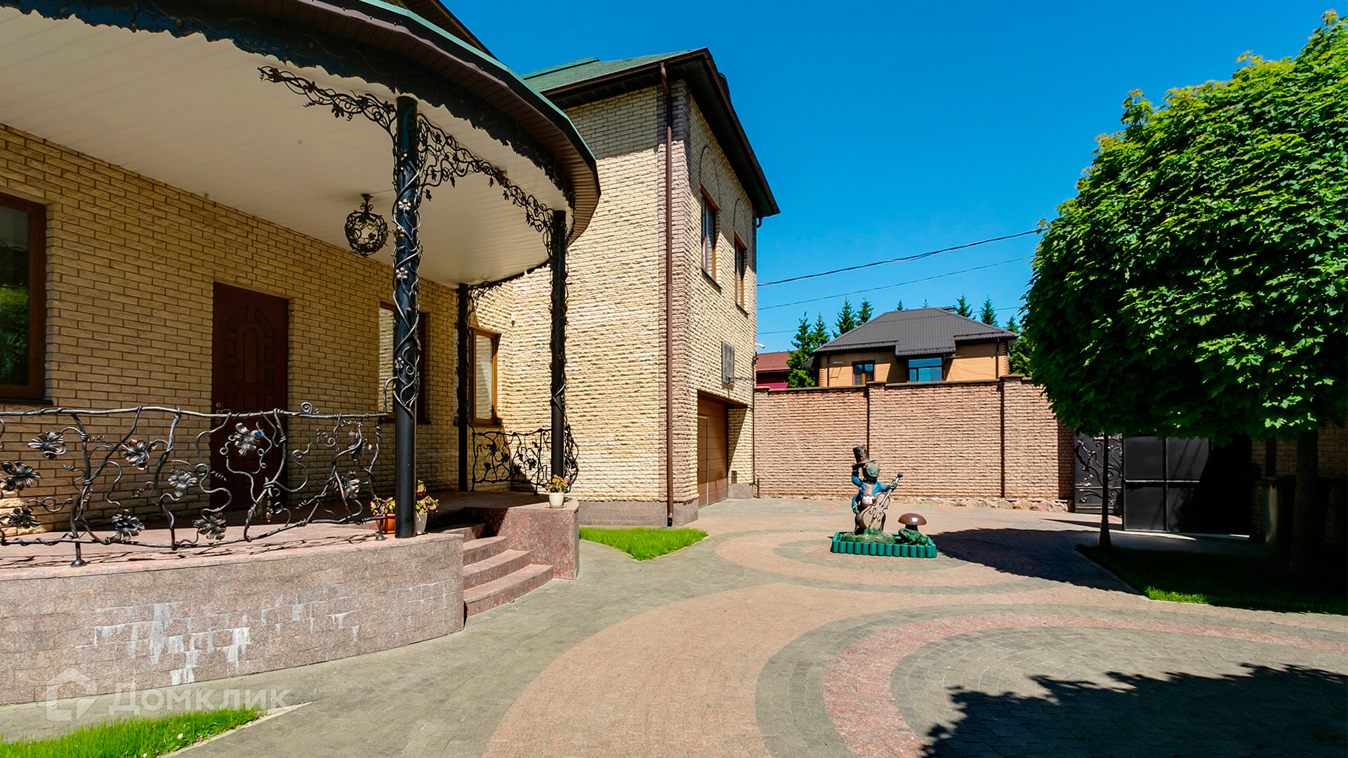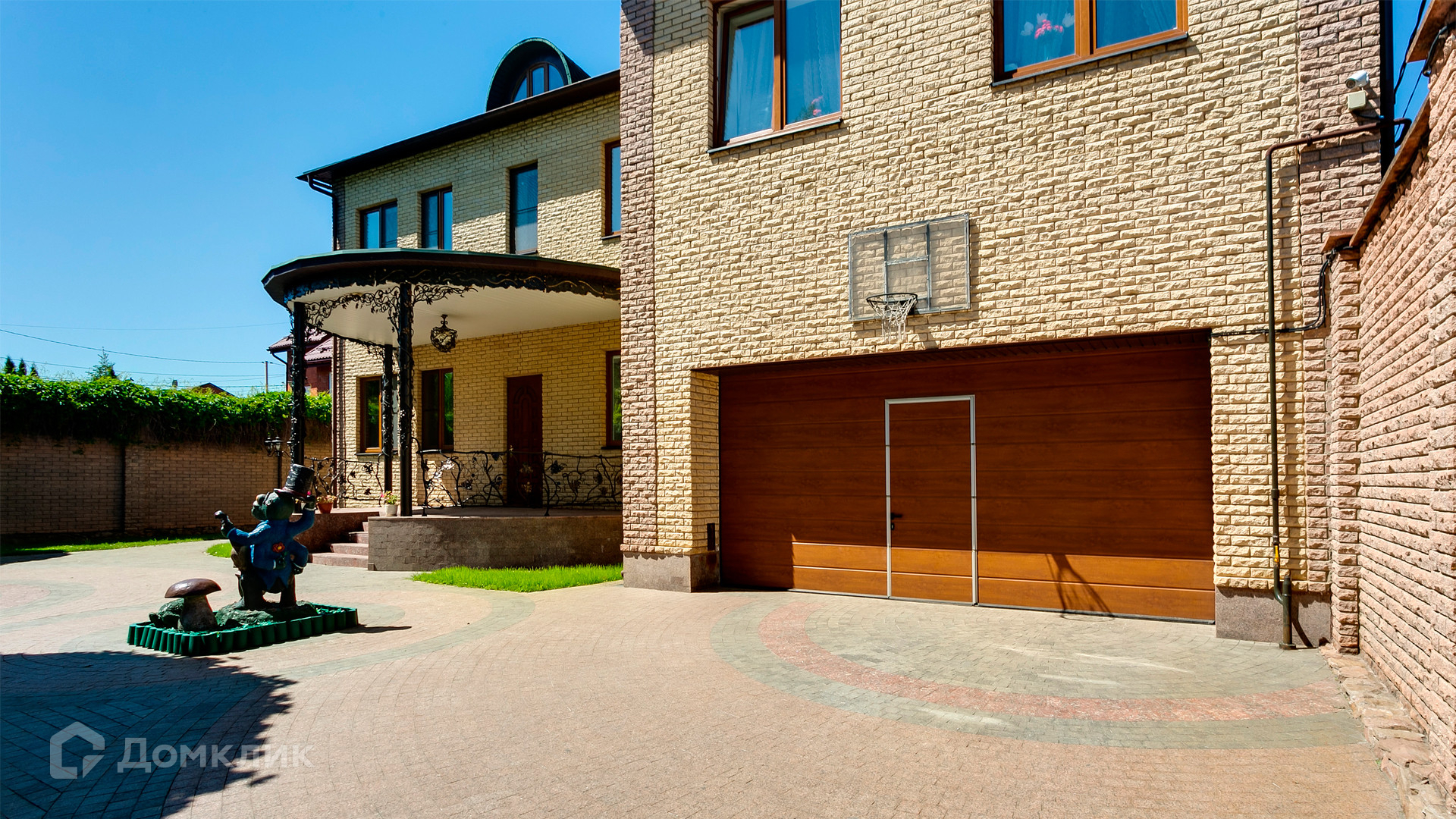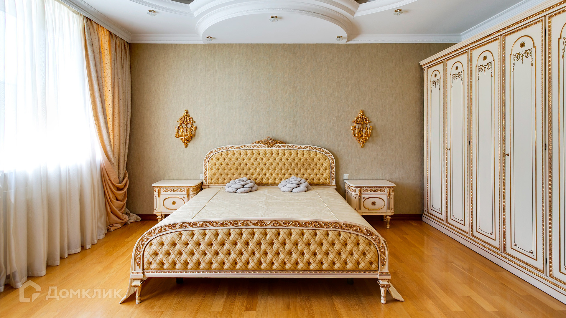 ID 10 375. Сколково. Коттедж площадью 674 м² расположен на полевом участке 16 соток с выходом к пруду. Фасад с большими окнами облицован желтым клинкерным кирпичом. Интерьер в классическом стиле оформлен в светлых оттенках, декорирован лепниной и колоннами с позолотой, зеркалами, витражами и деревом. Дом полностью меблирован, кухня оборудована бытовой техникой Miele. В резиденции спланировали 5 спален, каминный зал, кабинет, тренажерный зал, игровую, кинотеатр, бассейн и сауну. Предусмотрены гараж на 2 машины, блок для персонала, на территории — беседка, кладовая и навес на 2 машины. На участке выполнен ландшафтный дизайн, вымощены дорожки, оборудовано уличное освещение, высажены кустарники.