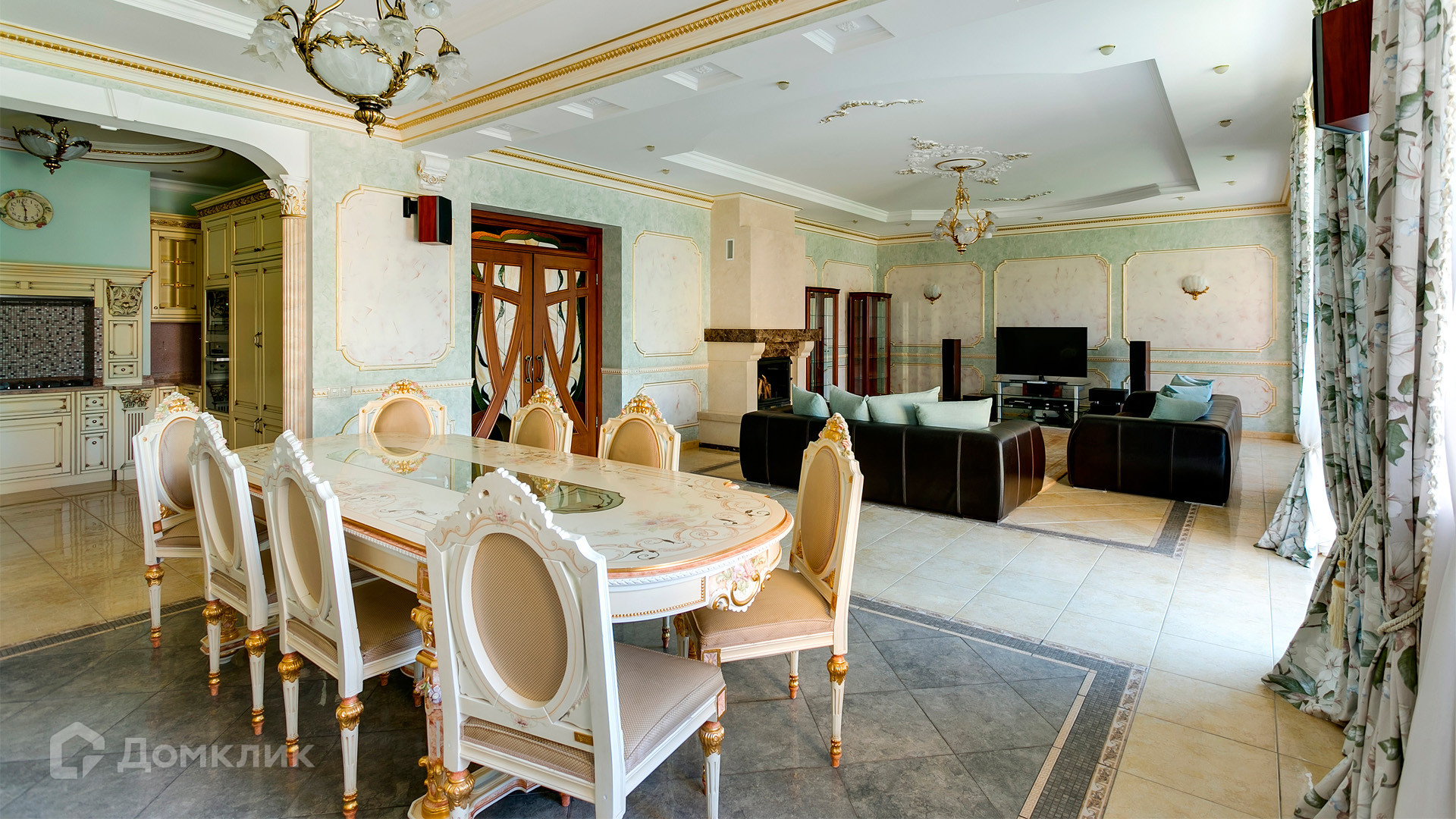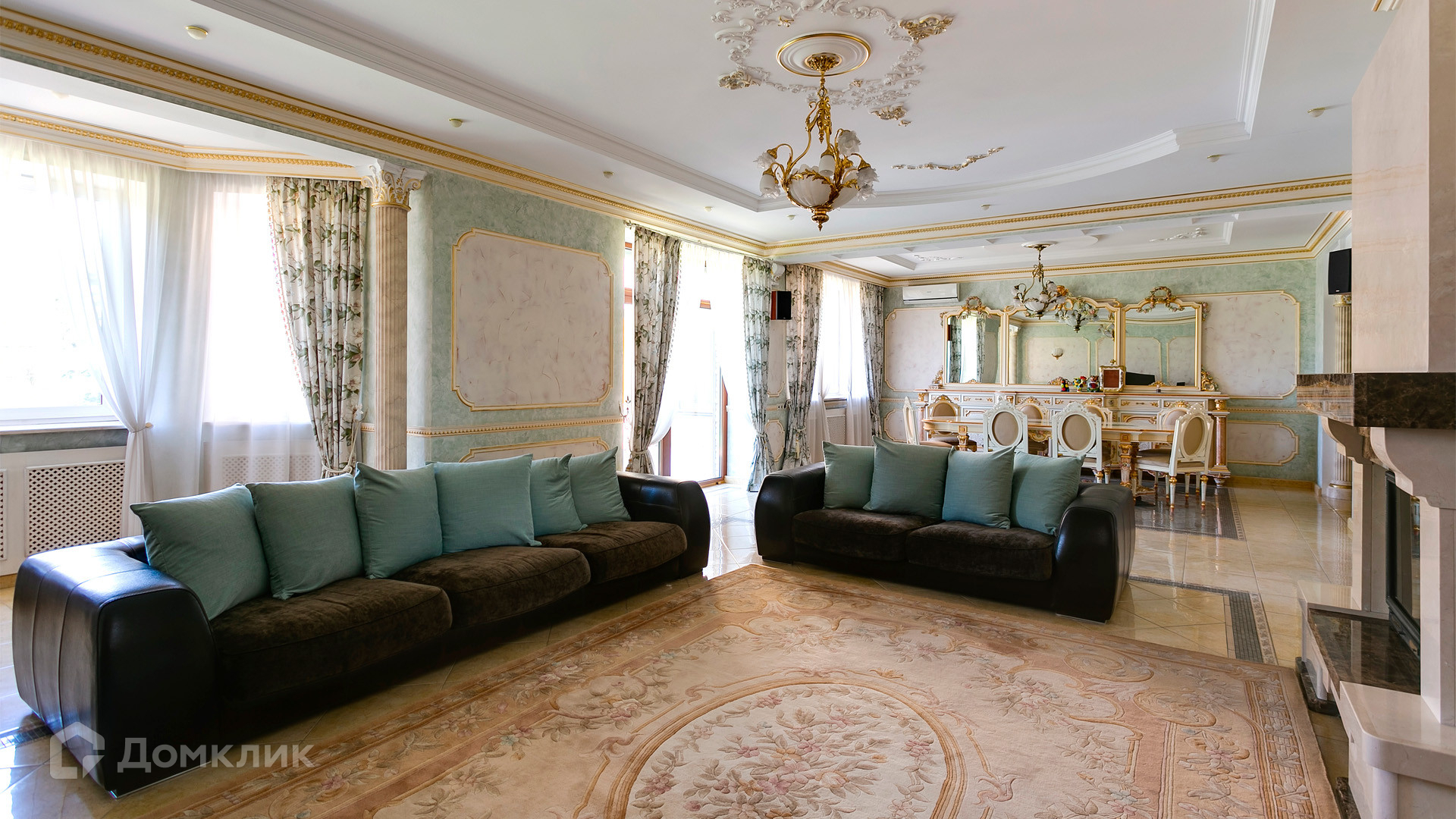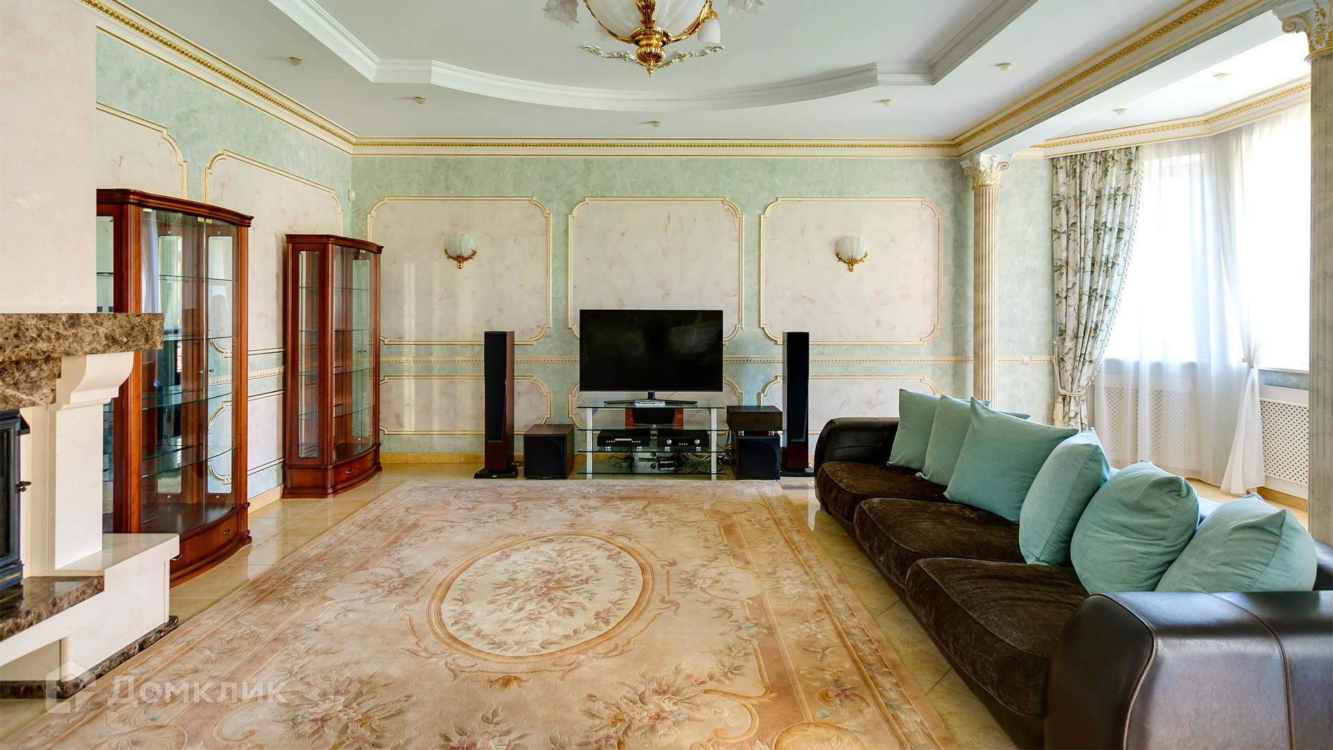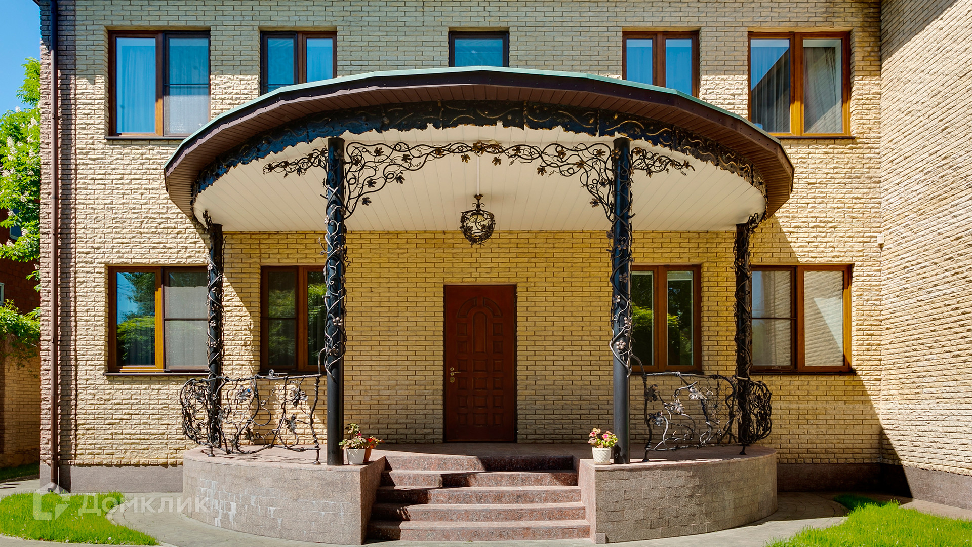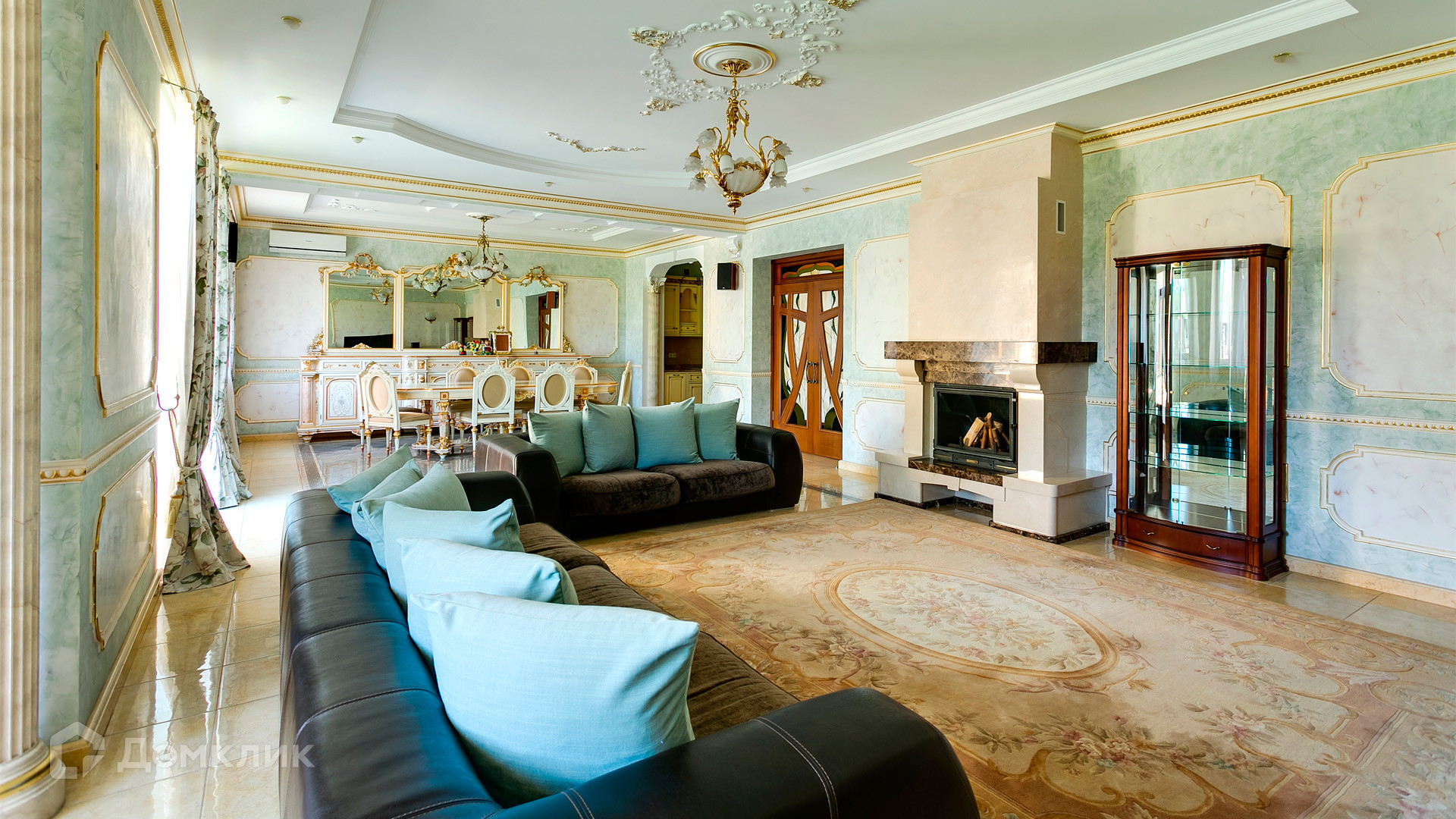 ID 10 375. Сколково. Коттедж площадью 674 м² расположен на полевом участке 16 соток с выходом к пруду. Фасад с большими окнами облицован желтым клинкерным кирпичом. Интерьер в классическом стиле оформлен в светлых оттенках, декорирован лепниной и колоннами с позолотой, зеркалами, витражами и деревом. Дом полностью меблирован, кухня оборудована бытовой техникой Miele. В резиденции спланировали 5 спален, каминный зал, кабинет, тренажерный зал, игровую, кинотеатр, бассейн и сауну. Предусмотрены гараж на 2 машины, блок для персонала, на территории — беседка, кладовая и навес на 2 машины. На участке выполнен ландшафтный дизайн, вымощены дорожки, оборудовано уличное освещение, высажены кустарники.