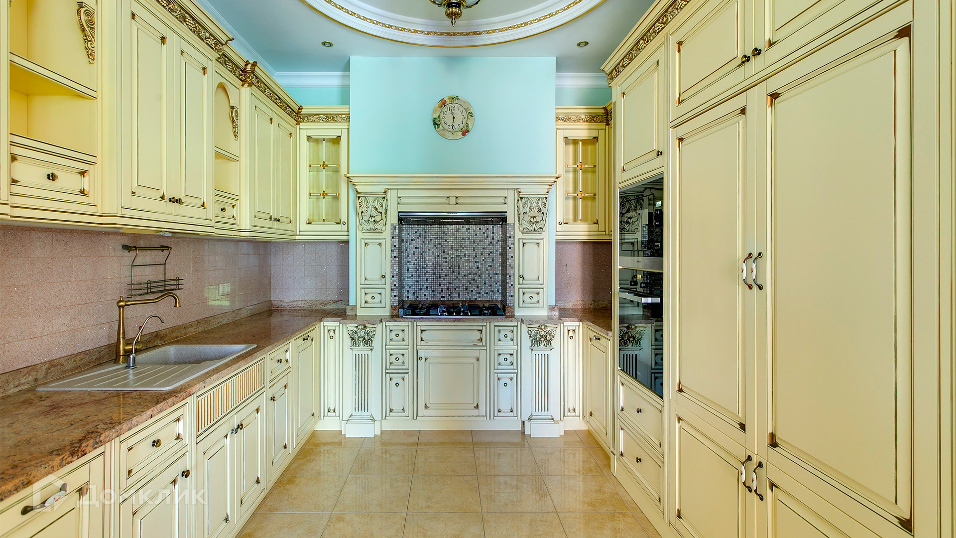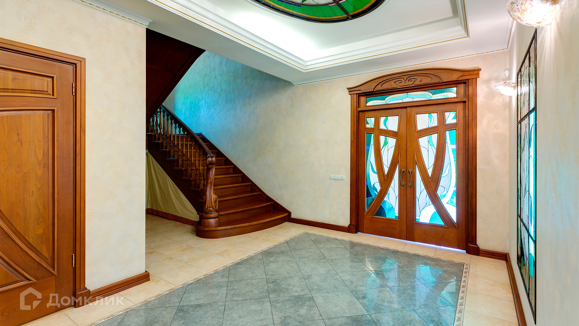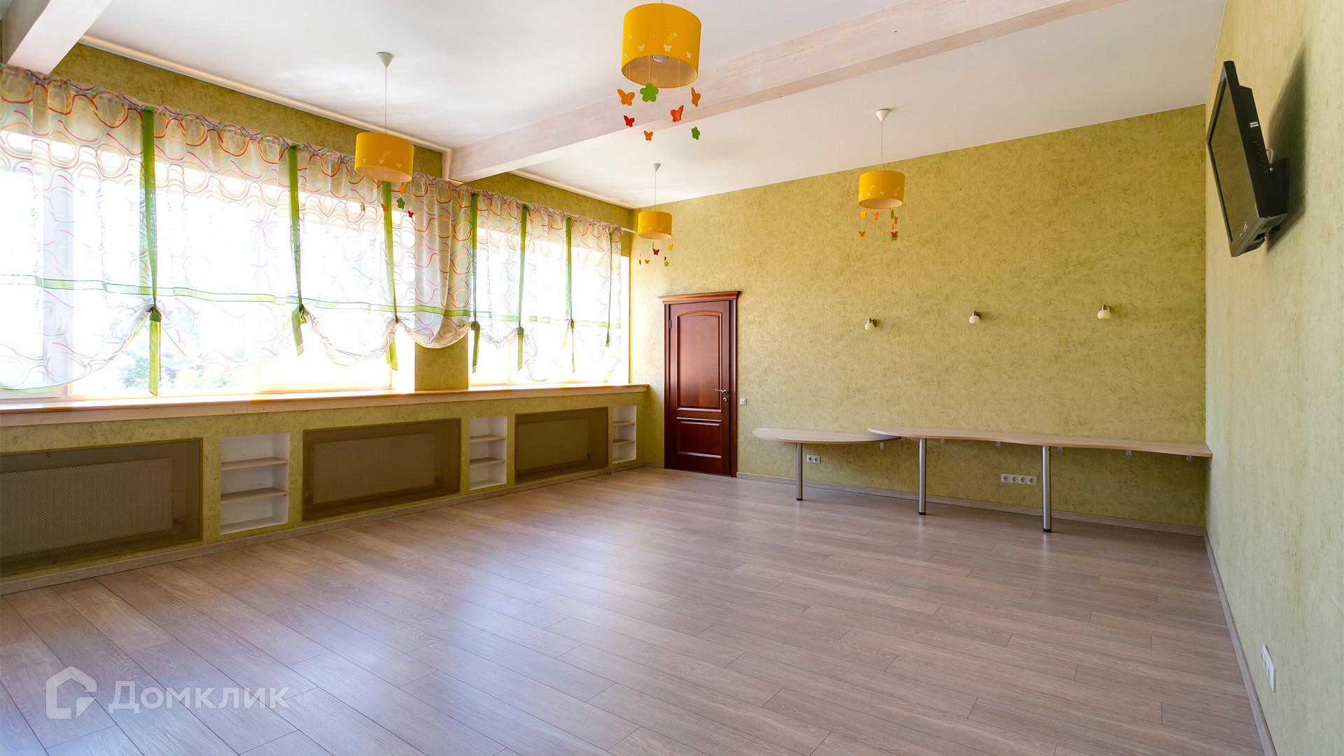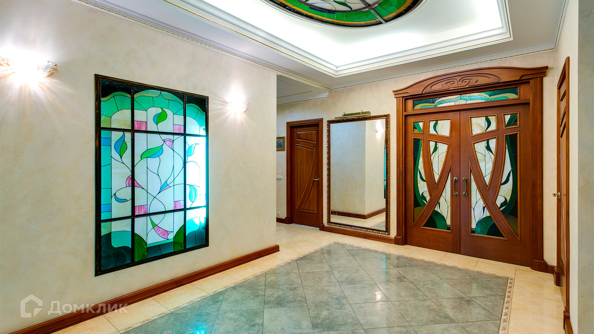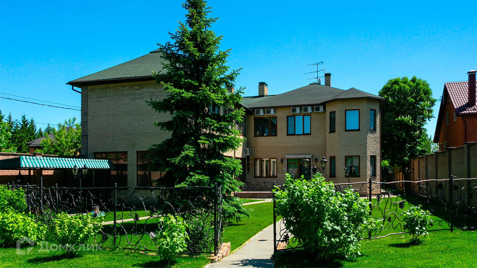ID 10 375. Сколково. Коттедж площадью 674 м² расположен на полевом участке 16 соток с выходом к пруду. Фасад с большими окнами облицован желтым клинкерным кирпичом. Интерьер в классическом стиле оформлен в светлых оттенках, декорирован лепниной и колоннами с позолотой, зеркалами, витражами и деревом. Дом полностью меблирован, кухня оборудована бытовой техникой Miele. В резиденции спланировали 5 спален, каминный зал, кабинет, тренажерный зал, игровую, кинотеатр, бассейн и сауну. Предусмотрены гараж на 2 машины, блок для персонала, на территории — беседка, кладовая и навес на 2 машины. На участке выполнен ландшафтный дизайн, вымощены дорожки, оборудовано уличное освещение, высажены кустарники.