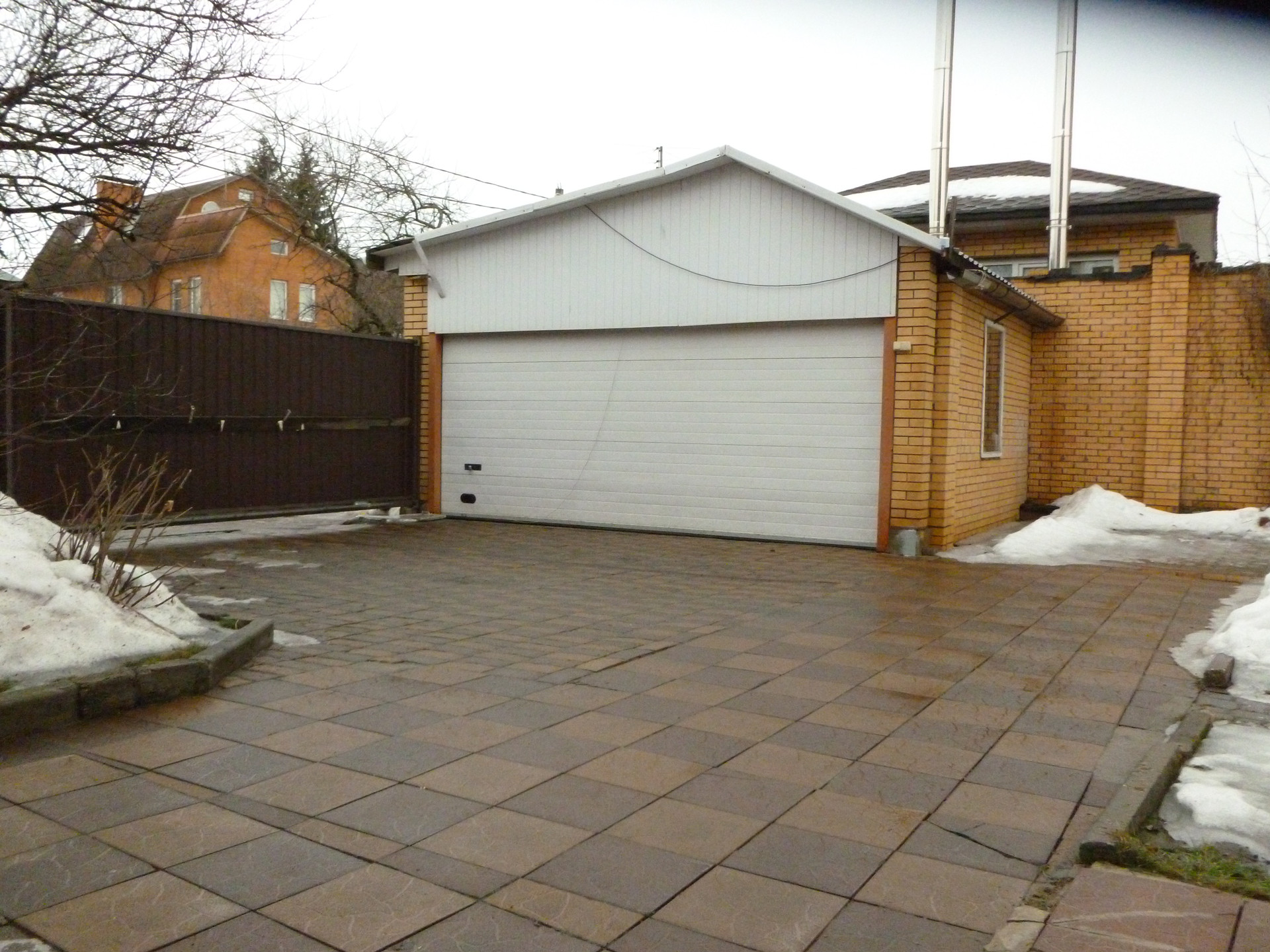 Дом разделен на две половины с отдельными въездами на участок с автоматическими воротами.