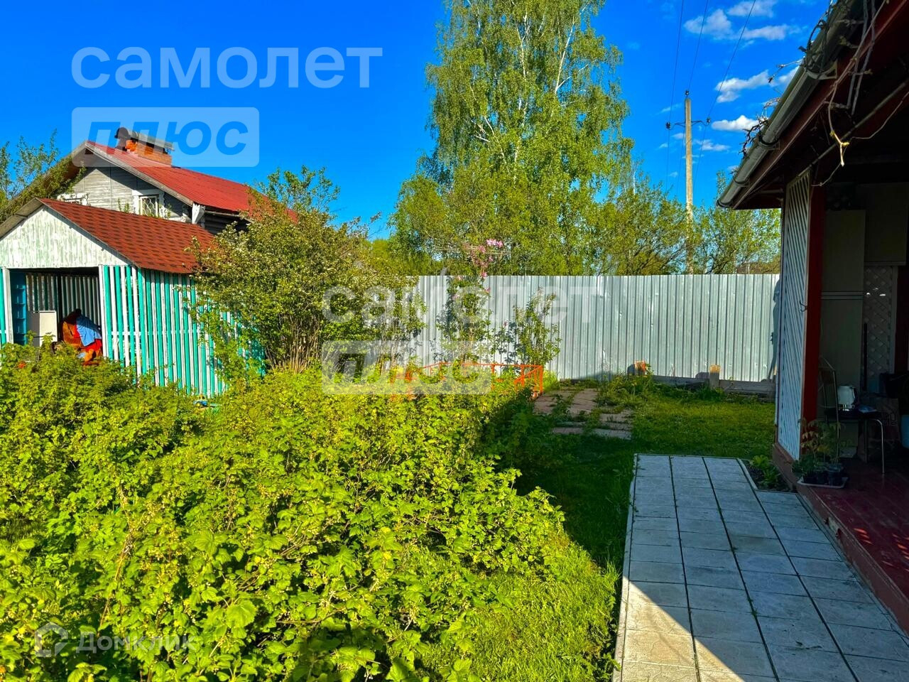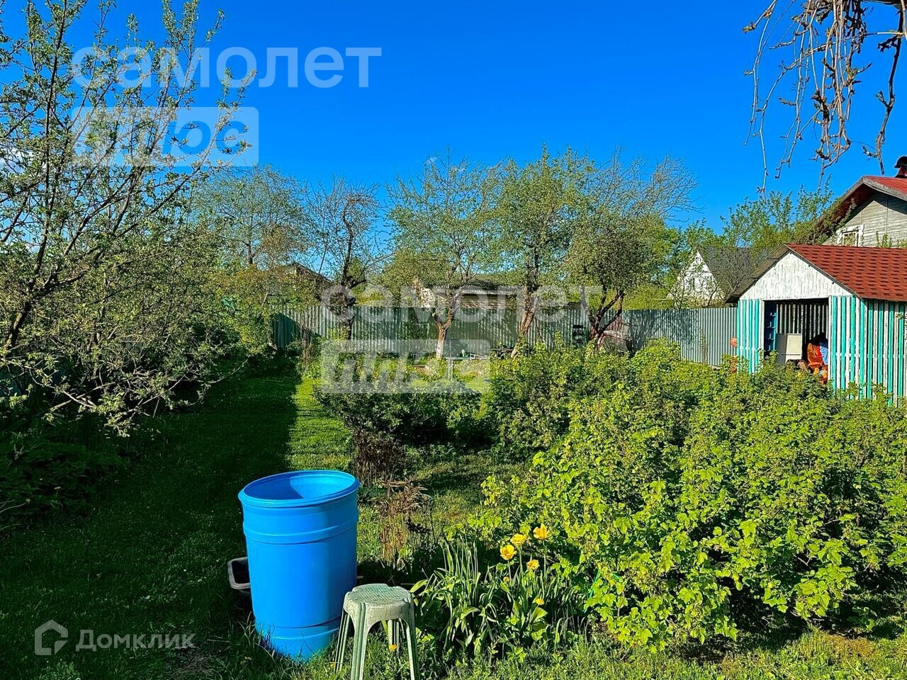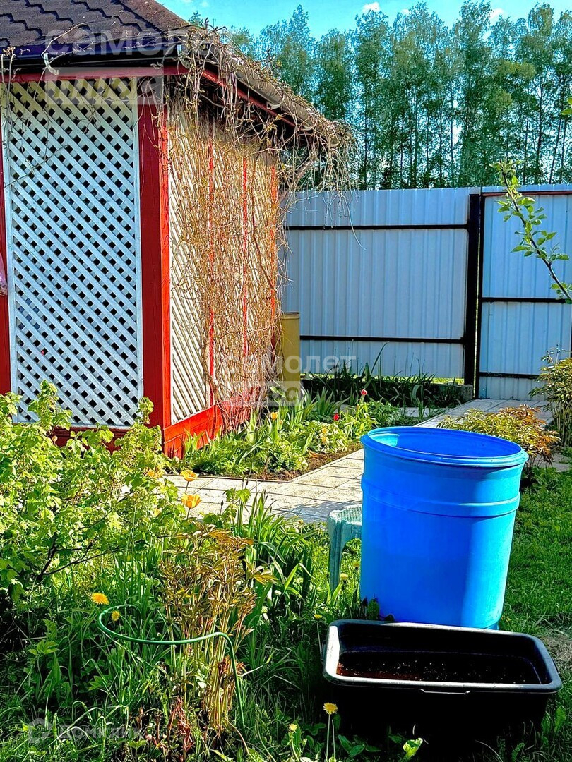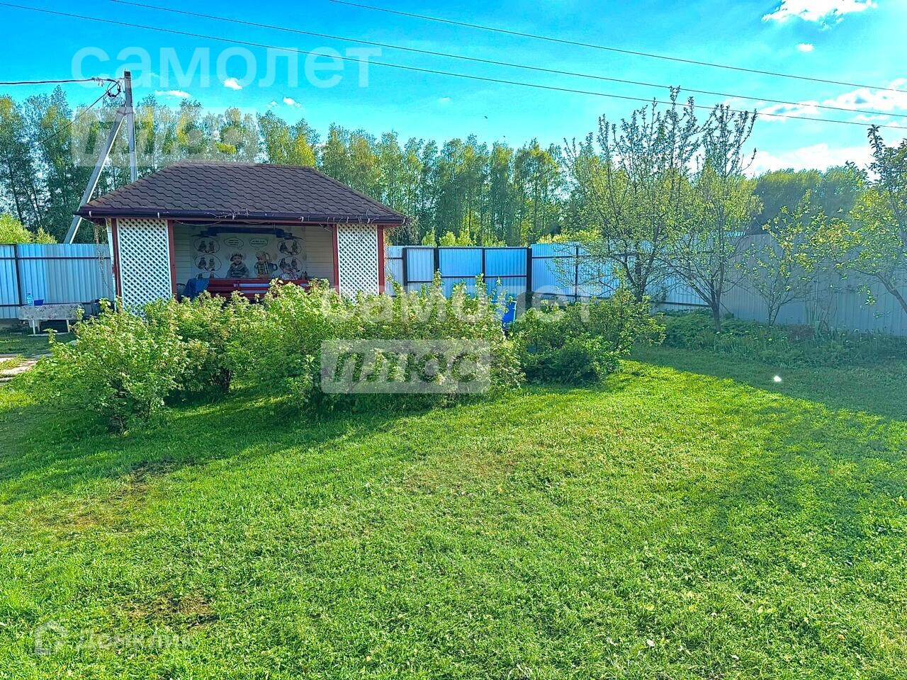 На Участке построена беседка, есть кустарники и деревья.
