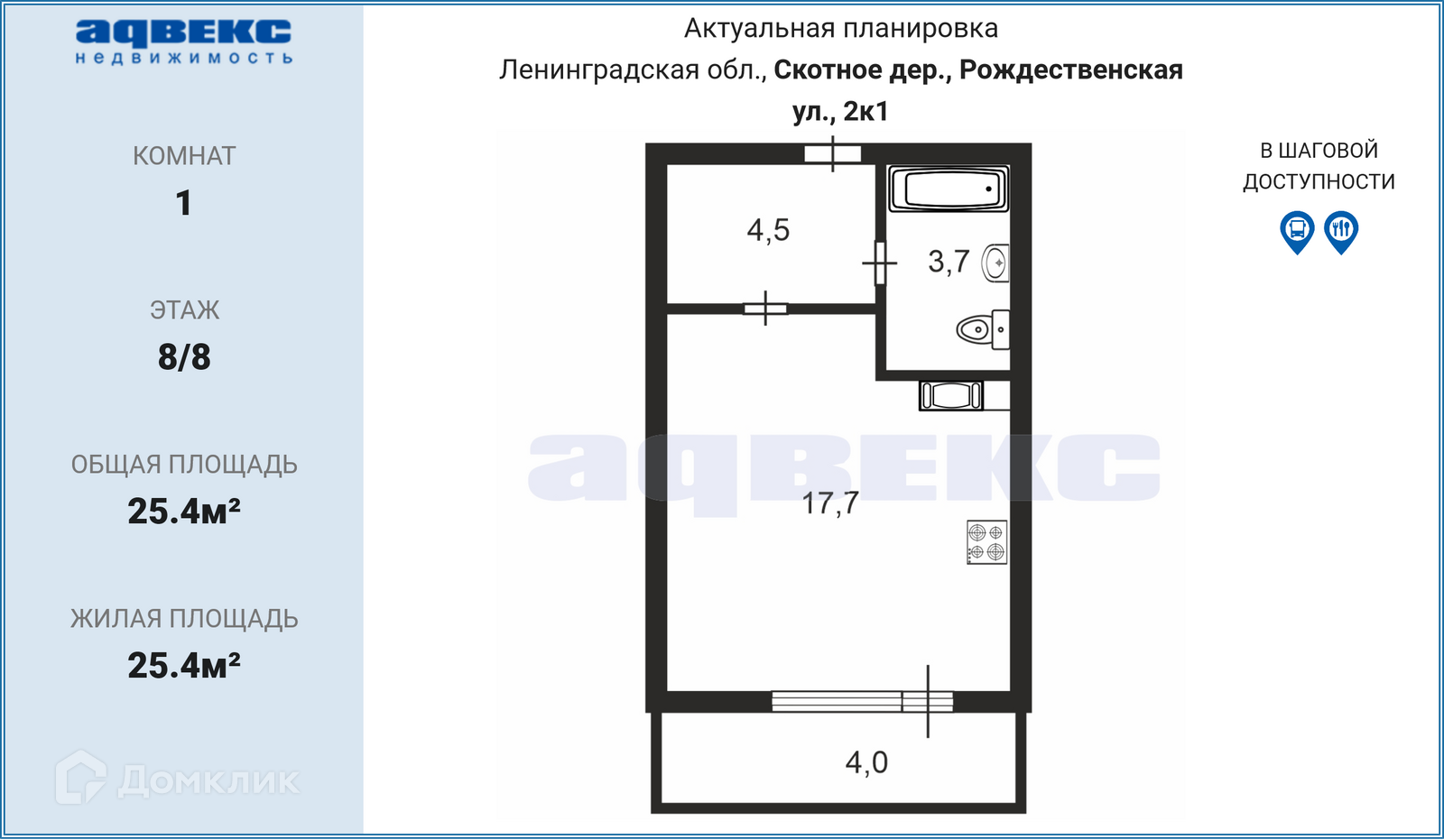Общая площадь 25.4 м2