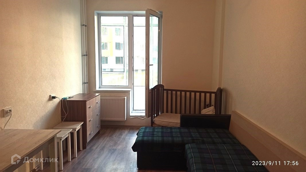 Есть минимум мебели и техники. Застеклённый панорамный балкон выходит во двор.