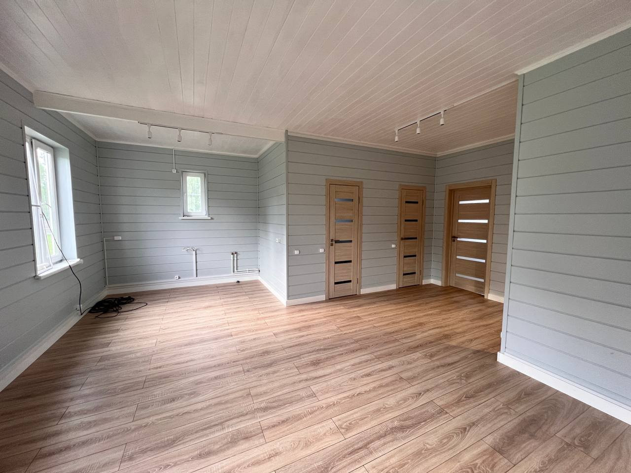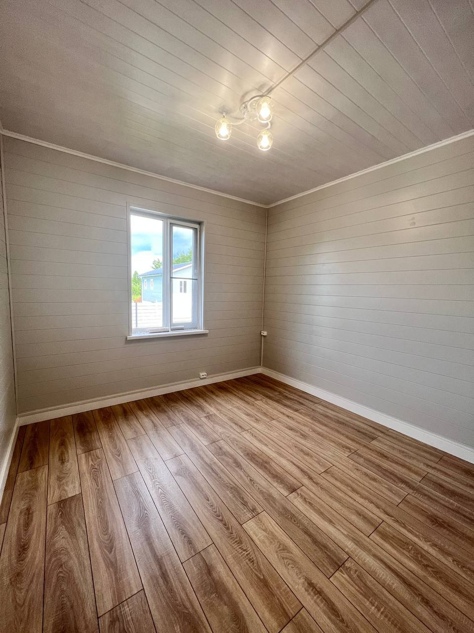 В зале и спальнях ламинат 33 класс износостойкости с фаской. Плинтуса из ангарской сосны 20х95.