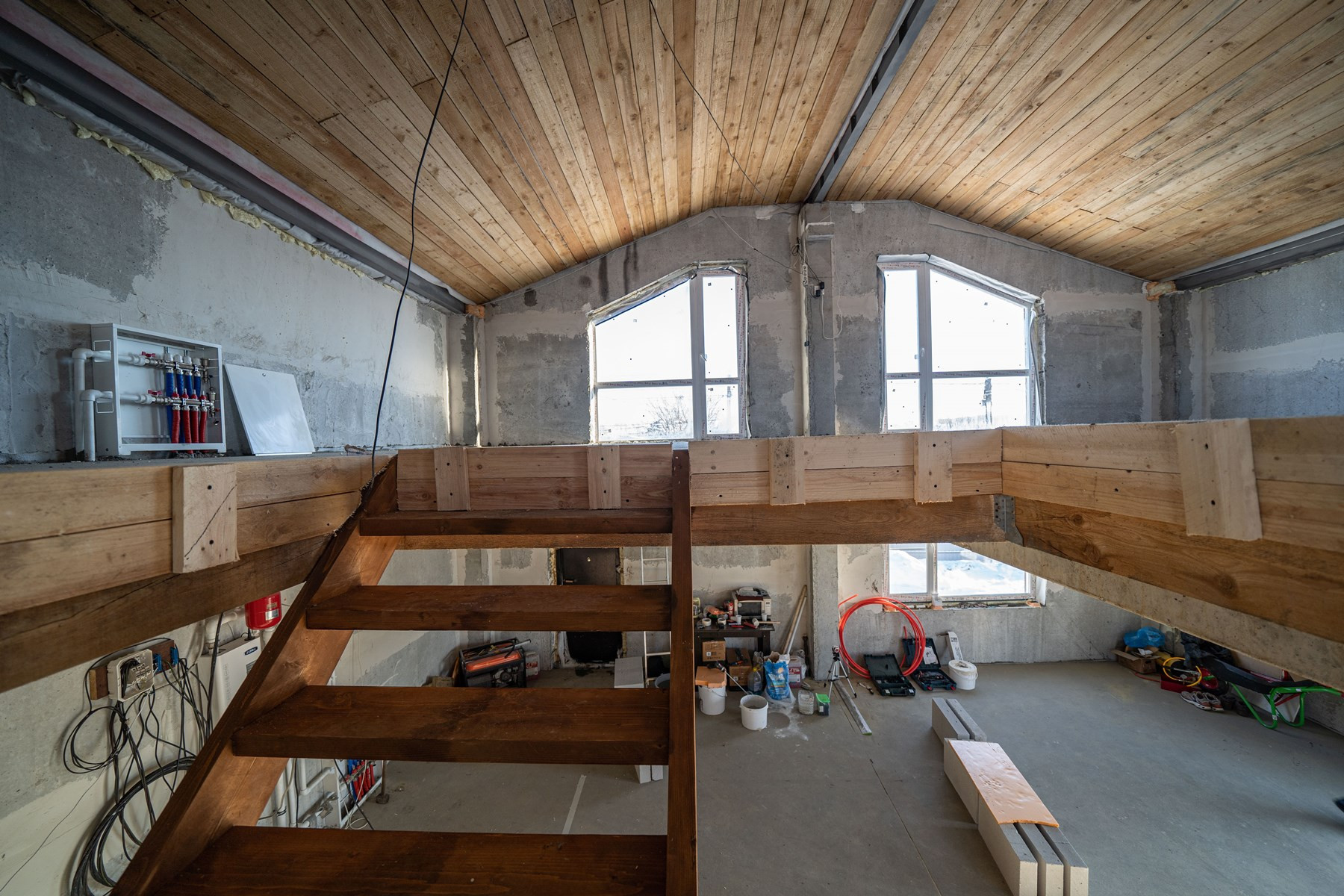 В доме продуманная планировка: в доме на первом этаже свободная планировка – общее пространство для кухни, столовой, гостиной, ванная комната. На втором этаже три жилые комнаты и второй санузел.