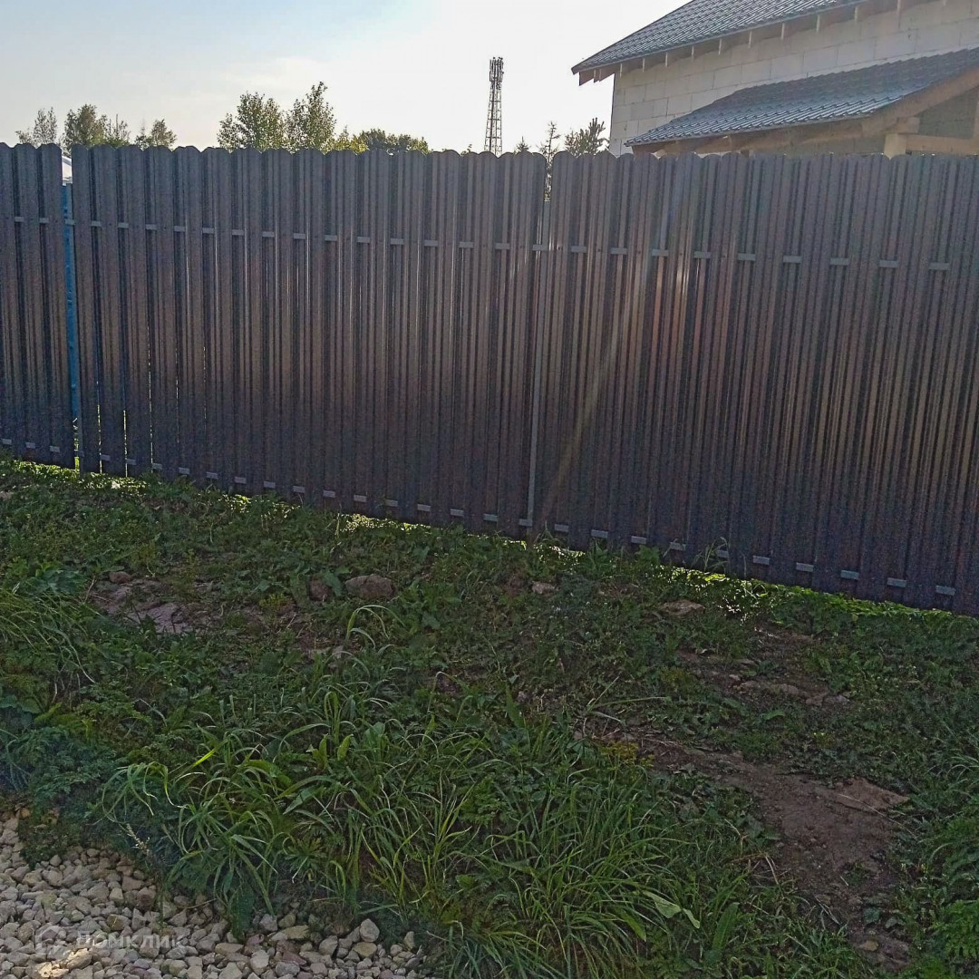По периметру участка каркас для забора, со стороны фасада зашит евроштакетником 125мм, в шахматном порядке;