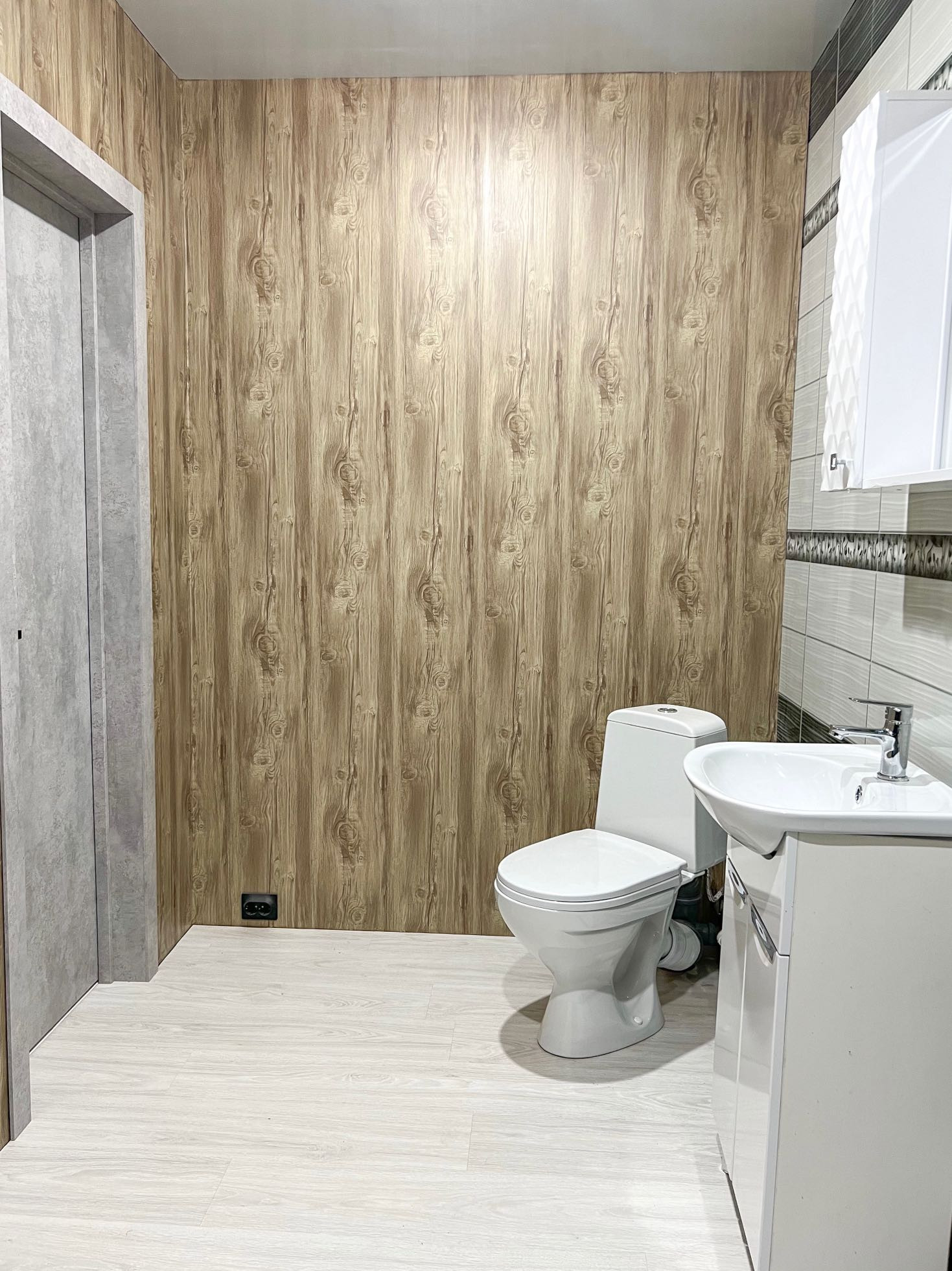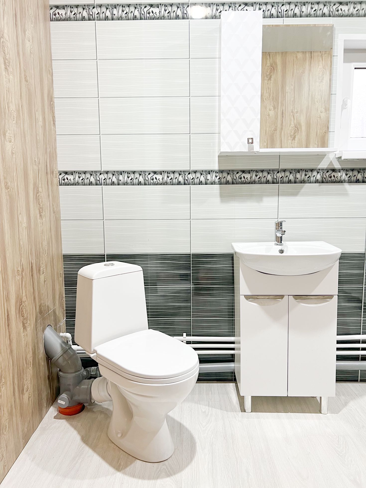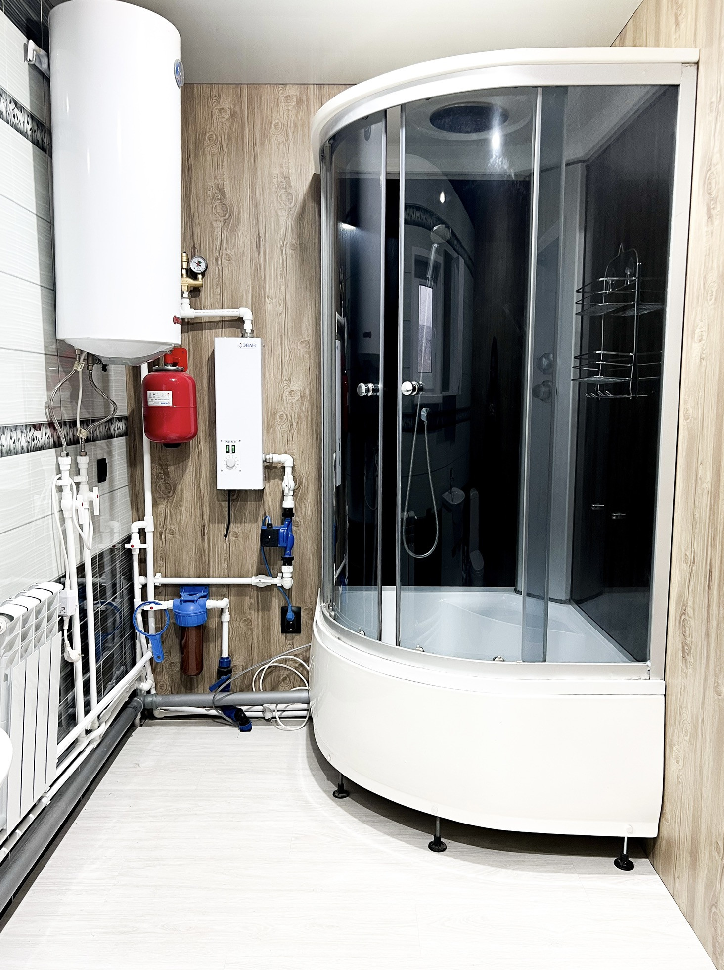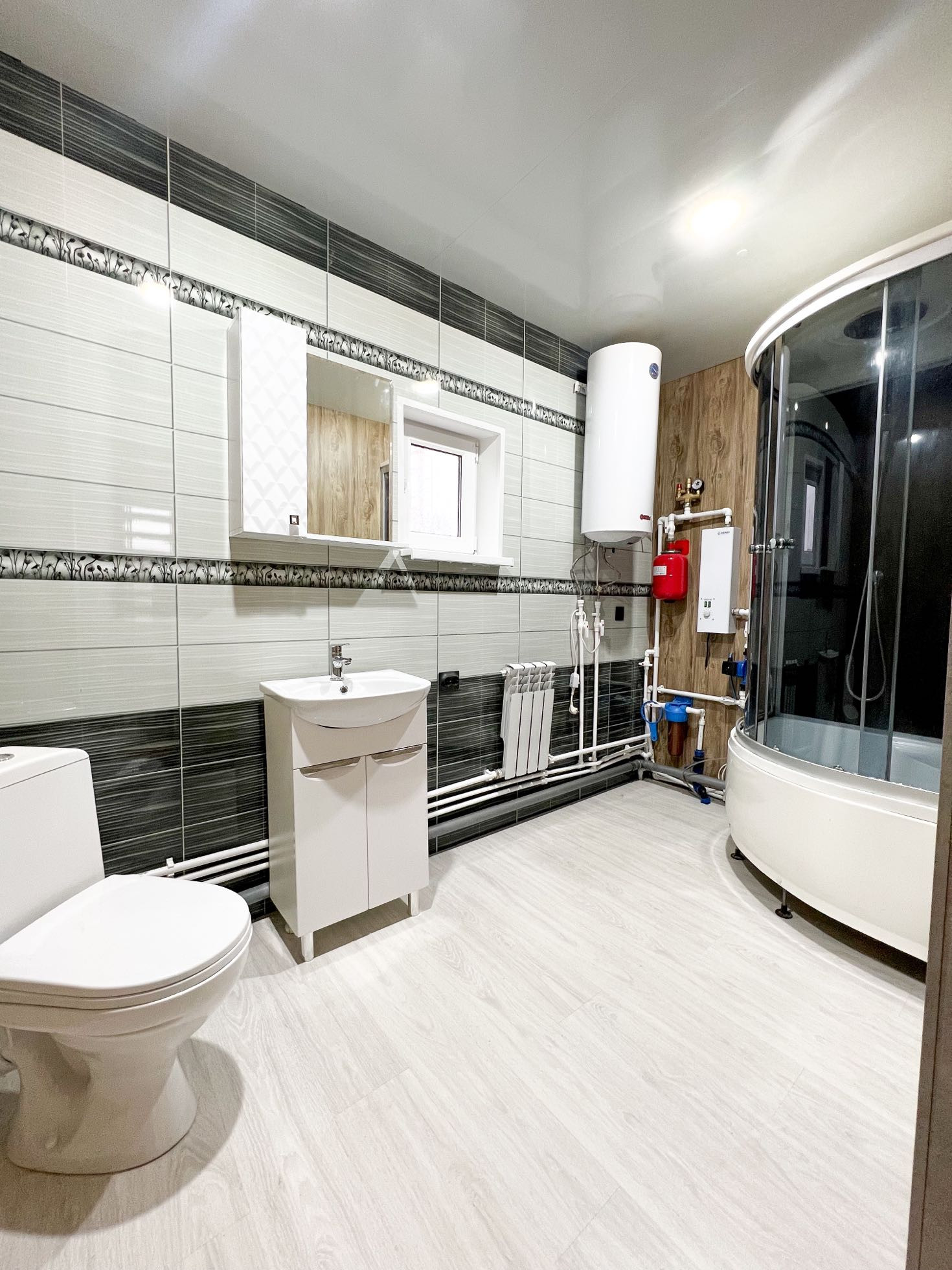 • совмещённый санузел 6 кв.м.: уставлена душевая кабина, боллер на 100 л., унитаз, тумба с мойкой и зеркалом, система отопления, фильтр, сделаны выводы для установки стиральной машины, отделка стен - панели, пол - ламинат 34 класса (влагостойкий)
