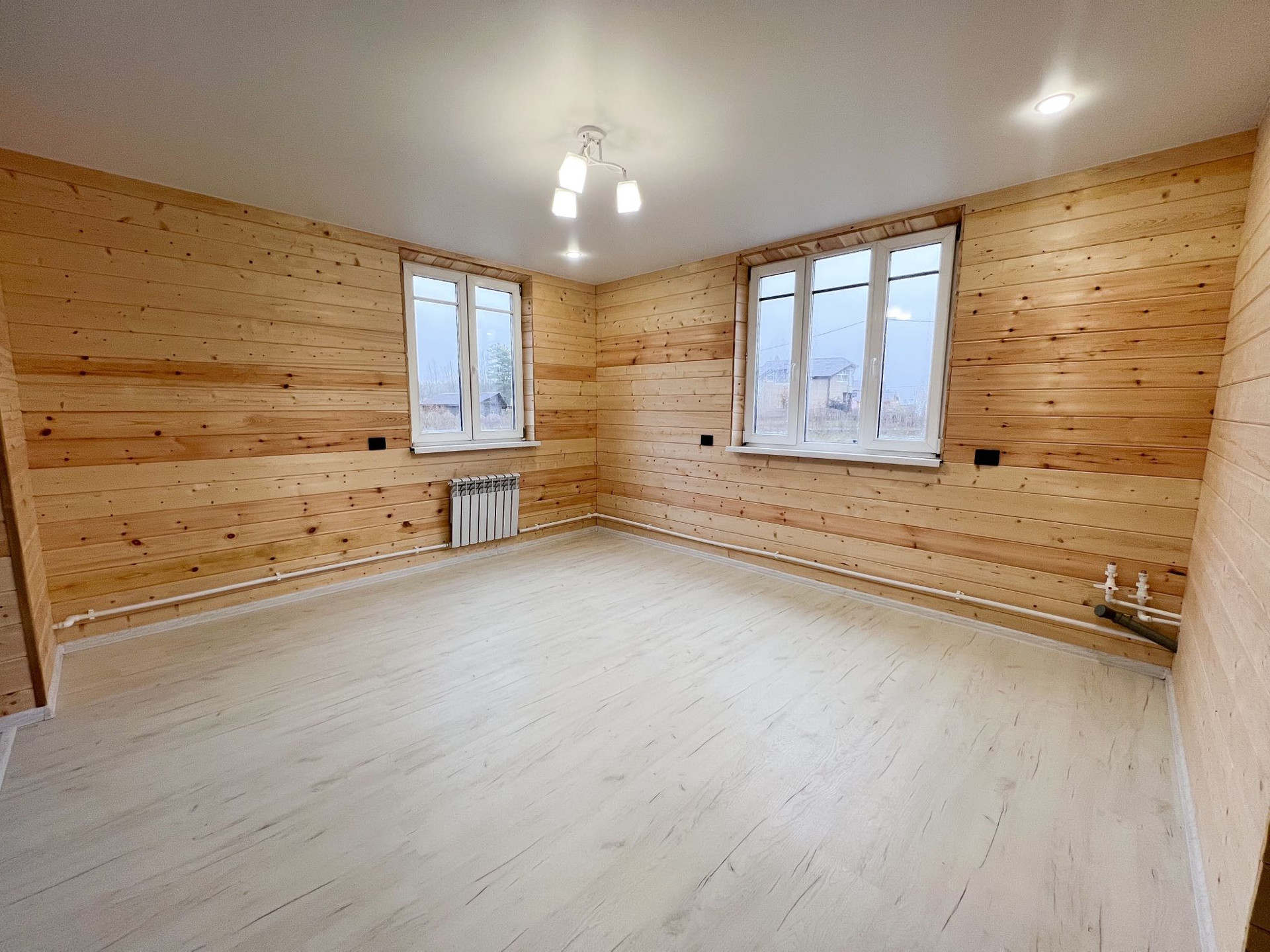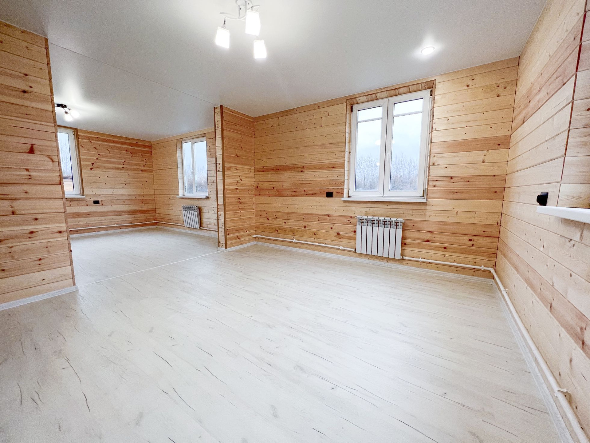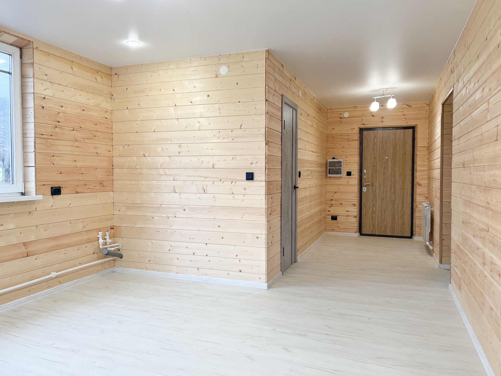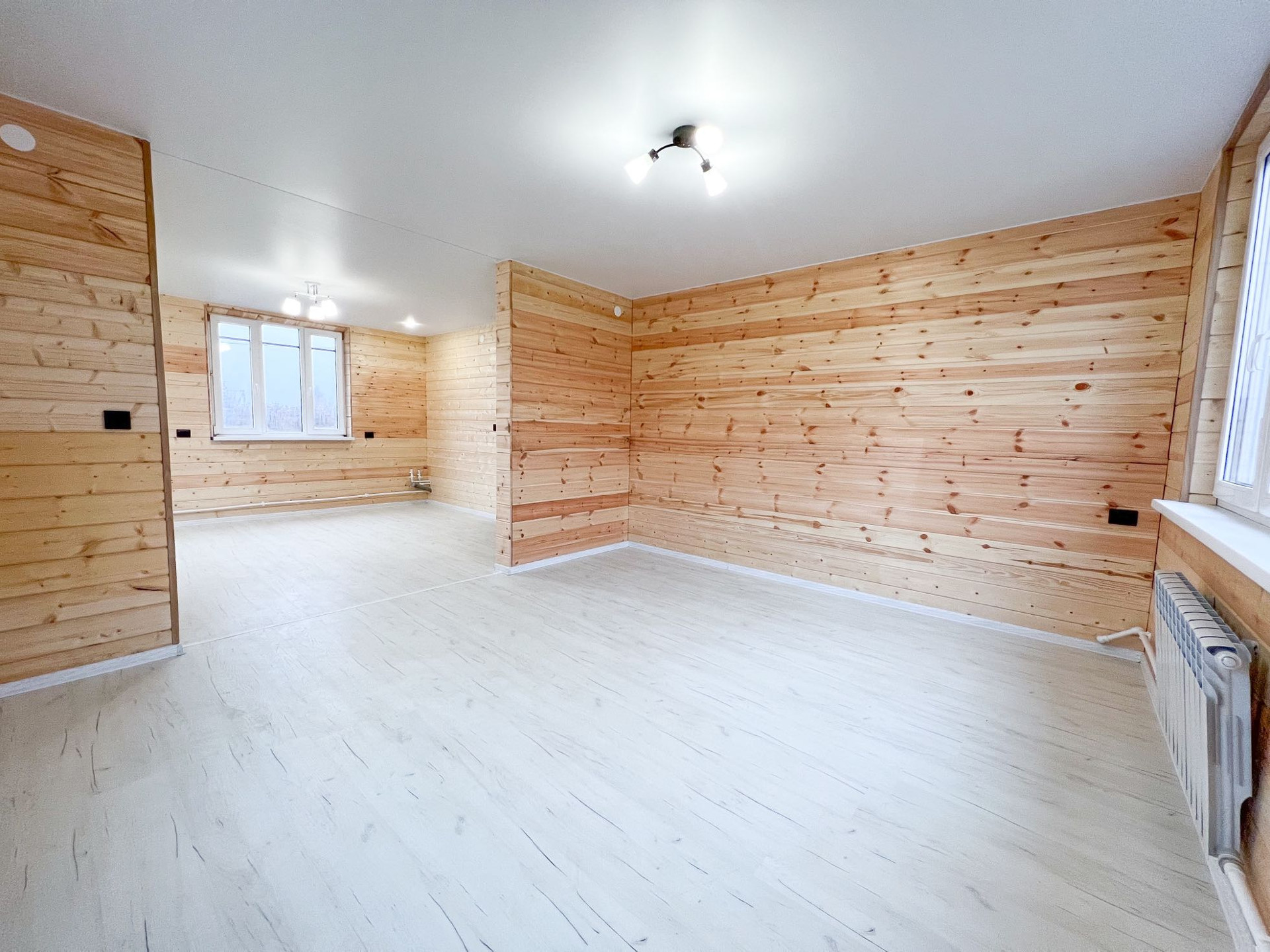 • просторная кухня-гостиная 30.5 кв.м. (при необходимости комнату можно изолировать), отделка: стены - имитация бруса, пол - ламинат 33 класса, подведены трубы водоснабжения и канализации для кухни