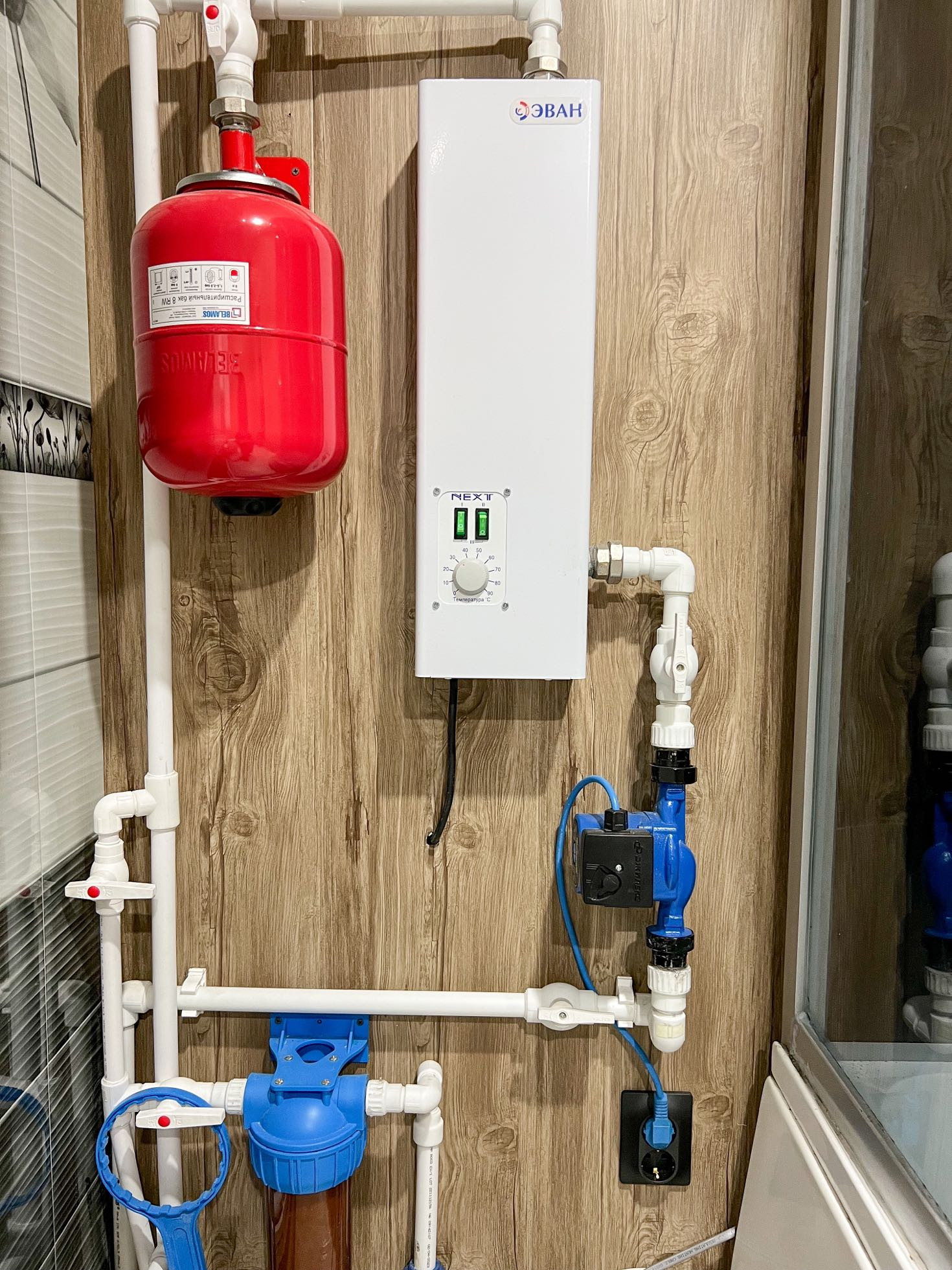 • отопление - электрический котёл 7 кВт, сделана разводка труб отопления, установлены радиаторы, в системе антифриз