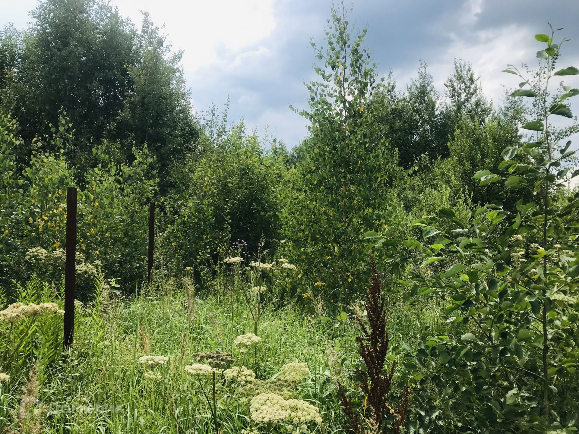 Участок правильной формы, не огорожен. На участке растут молодые березы.