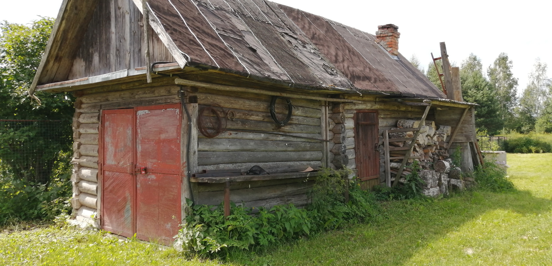 Баня рубленая из бревна старенькая, но все работает. К бане пристроен небольшой гараж.