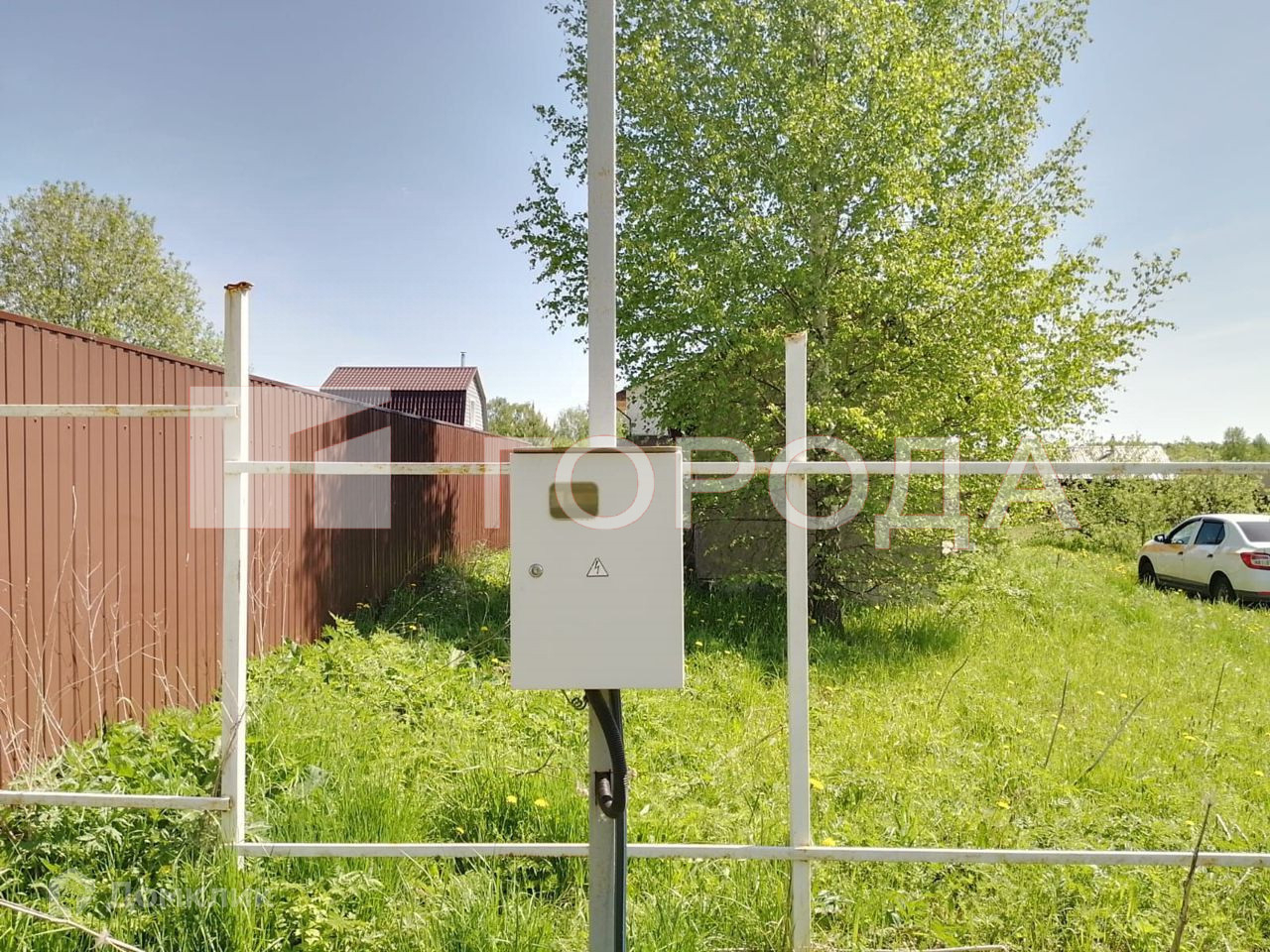 Водоносный слой не глубоко. У соседей колодцы, вода хорошая. Три соседские стороны имеют забор из профнастила. Со стороны дороги каркас на столбах. Столбы установлены с учётом установки ворот в двух местах (слева - главные с калиткой, справа - технические).