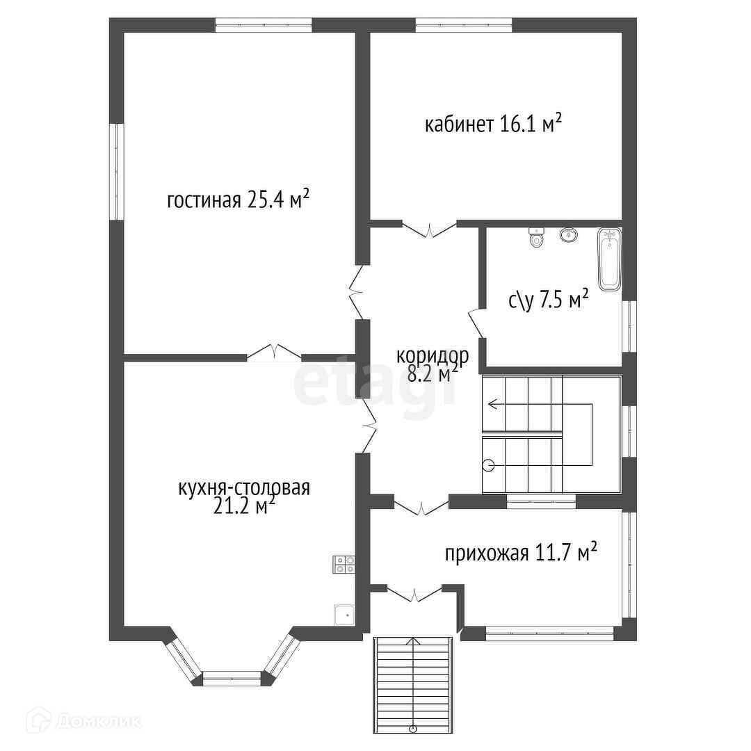 Жилая площадь 106,77м2. Кухня-столовая — 21,2м2 (без учета эркера). Гостиная — 25,3м2. Два С/У на первом и втором этажах по 7м2. Общая площадь 285м2.